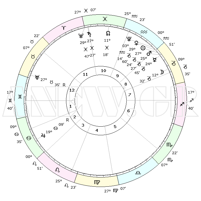 | | ΘΕΣΕΙΣ ΠΛΑΝΗΤΩΝ ΑΣΤΡΟΛΟΓΙΚΟΥ ΧΑΡΤΗ ΤΗΣ ΣΤΙΓΜΗΣ ΑΥΤΗΣ | | | | Πλανήτης | Ζώδιο | Μοίρες | Δεκαήμ. | Σε οίκο | Απόκλιση | | Ακμές των οίκων | | Ηλιος | Αιγόκερως | 27°19' | Τρίτο | 10 | 20 S 41 | | 1ος | 14°05' | Ταύρος | | Σελήνη | Αιγόκερως | 11°33' | Δεύτερο | 9 | 27 S 17 | | 2ος | 12°33' | Δίδυμοι | | Ερμής | Αιγόκερως | 24°37' | Τρίτο | 9 | 23 S 04 | | 3ος | 04°51' | Καρκίνος | | Αφροδίτη | Αιγόκερως | 29°54' | Τρίτο | 10 | 21 S 11 | | 4ος | 26°47' | Καρκίνος | | Αρης | Αιγόκερως | 25°23' | Τρίτο | 9 | 22 S 01 | | 5ος | 22°49' | Λέων | | Δίας | Καρκίνος | 19°09'R | Δεύτερο | 3 | 22 N 20 | | 6ος | 28°21' | Παρθένος | | Κρόνος | Ιχθείς | 27°26' | Τρίτο | 11 | 03 S 03 | | 7ος | 14°05' | Σκορπιός | | Ουρανός | Ταύρος | 27°35'R | Τρίτο | 1 | 19 N 26 | | 8ος | 12°33' | Τοξότης | | Ποσειδώνας | Ιχθείς | 29°47' | Τρίτο | 12 | 01 S 18 | | 9ος | 04°51' | Αιγόκερως | | Πλούτωνας | Υδροχόος | 03°14' | Πρώτο | 10 | 23 S 07 | | 10ος | 26°47' | Αιγόκερως | | Β. Δεσμός | Ιχθείς | 11°18' | Δεύτερο | 11 | 07 S 20 | | 11ος | 22°49' | Υδροχόος | | Ωροσκόπος | Ταύρος | 14°05' | Δεύτερο | | | 12ος | 28°21' | Ιχθείς | | Μεσουράνημα | Αιγόκερως | 26°47' | Τρίτο | | | |