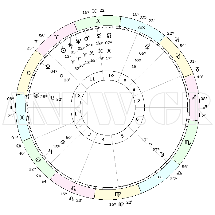 | | ΘΕΣΕΙΣ ΠΛΑΝΗΤΩΝ ΑΣΤΡΟΛΟΓΙΚΟΥ ΧΑΡΤΗ ΤΗΣ ΣΤΙΓΜΗΣ ΑΥΤΗΣ | | | | Πλανήτης | Ζώδιο | Μοίρες | Δεκαήμ. | Σε οίκο | Απόκλιση | | Ακμές των οίκων | | Ηλιος | Κριός | 13°28' | Δεύτερο | 12 | 05 N 19 | | 1ος | 04°54' | Ταύρος | | Σελήνη | Ζυγός | 26°23' | Τρίτο | 6 | 13 S 45 | | 2ος | 05°47' | Δίδυμοι | | Ερμής | Ιχθείς | 15°42' | Δεύτερο | 11 | 07 S 08 | | 3ος | 28°52' | Δίδυμοι | | Αφροδίτη | Ταύρος | 04°23' | Πρώτο | 12 | 12 N 39 | | 4ος | 20°35' | Καρκίνος | | Αρης | Ιχθείς | 24°51' | Τρίτο | 12 | 03 S 00 | | 5ος | 15°30' | Λέων | | Δίας | Καρκίνος | 15°56' | Δεύτερο | 3 | 22 N 51 | | 6ος | 19°11' | Παρθένος | | Κρόνος | Κριός | 05°56' | Πρώτο | 12 | 00 N 24 | | 7ος | 04°54' | Σκορπιός | | Ουρανός | Ταύρος | 28°52' | Τρίτο | 1 | 19 N 44 | | 8ος | 05°47' | Τοξότης | | Ποσειδώνας | Κριός | 02°18' | Πρώτο | 12 | 00 S 17 | | 9ος | 28°52' | Τοξότης | | Πλούτωνας | Υδροχόος | 05°15' | Πρώτο | 10 | 22 S 47 | | 10ος | 20°35' | Αιγόκερως | | Β. Δεσμός | Ιχθείς | 07°17' | Πρώτο | 11 | 08 S 50 | | 11ος | 15°30' | Υδροχόος | | Ωροσκόπος | Ταύρος | 04°54' | Πρώτο | | | 12ος | 19°11' | Ιχθείς | | Μεσουράνημα | Αιγόκερως | 20°35' | Τρίτο | | | |