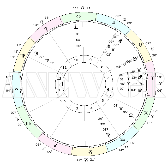 | | ΘΕΣΕΙΣ ΠΛΑΝΗΤΩΝ ΑΣΤΡΟΛΟΓΙΚΟΥ ΧΑΡΤΗ ΤΗΣ ΣΤΙΓΜΗΣ ΑΥΤΗΣ | | | | Πλανήτης | Ζώδιο | Μοίρες | Δεκαήμ. | Σε οίκο | Απόκλιση | | Ακμές των οίκων | | Ηλιος | Ταύρος | 06°20' | Πρώτο | 8 | 13 N 38 | | 1ος | 23°05' | Παρθένος | | Σελήνη | Παρθένος | 06°48' | Πρώτο | 12 | 09 N 04 | | 2ος | 19°08' | Ζυγός | | Ερμής | Κριός | 17°60' | Δεύτερο | 7 | 04 N 54 | | 3ος | 19°17' | Σκορπιός | | Αφροδίτη | Δίδυμοι | 02°55' | Πρώτο | 9 | 21 N 26 | | 4ος | 22°13' | Τοξότης | | Αρης | Κριός | 12°59' | Δεύτερο | 7 | 04 N 17 | | 5ος | 25°19' | Αιγόκερως | | Δίας | Καρκίνος | 18°19' | Δεύτερο | 10 | 22 N 34 | | 6ος | 26°01' | Υδροχόος | | Κρόνος | Κριός | 08°45' | Πρώτο | 7 | 01 N 29 | | 7ος | 23°05' | Ιχθείς | | Ουρανός | Δίδυμοι | 00°02' | Πρώτο | 9 | 19 N 59 | | 8ος | 19°08' | Κριός | | Ποσειδώνας | Κριός | 03°07' | Πρώτο | 7 | 00 N 02 | | 9ος | 19°17' | Ταύρος | | Πλούτωνας | Υδροχόος | 05°29' | Πρώτο | 5 | 22 S 48 | | 10ος | 22°13' | Δίδυμοι | | Β. Δεσμός | Ιχθείς | 06°03' | Πρώτο | 6 | 09 S 17 | | 11ος | 25°19' | Καρκίνος | | Ωροσκόπος | Παρθένος | 23°05' | Τρίτο | | | 12ος | 26°01' | Λέων | | Μεσουράνημα | Δίδυμοι | 22°13' | Τρίτο | | | |