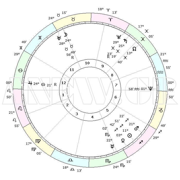 | | ΘΕΣΕΙΣ ΠΛΑΝΗΤΩΝ ΑΣΤΡΟΛΟΓΙΚΟΥ ΧΑΡΤΗ ΤΗΣ ΣΤΙΓΜΗΣ ΑΥΤΗΣ | | | | Πλανήτης | Ζώδιο | Μοίρες | Δεκαήμ. | Σε οίκο | Απόκλιση | | Ακμές των οίκων | | Ηλιος | Τοξότης | 11°50' | Δεύτερο | 5 | 22 S 12 | | 1ος | 22°14' | Καρκίνος | | Σελήνη | Ταύρος | 24°22' | Τρίτο | 11 | 23 N 25 | | 2ος | 12°51' | Λέων | | Ερμής | Σκορπιός | 22°01' | Τρίτο | 5 | 15 S 46 | | 3ος | 06°53' | Παρθένος | | Αφροδίτη | Τοξότης | 03°40' | Πρώτο | 5 | 20 S 17 | | 4ος | 06°50' | Ζυγός | | Αρης | Τοξότης | 21°21' | Τρίτο | 6 | 23 S 50 | | 5ος | 12°53' | Σκορπιός | | Δίας | Καρκίνος | 24°21'R | Τρίτο | 1 | 21 N 24 | | 6ος | 19°54' | Τοξότης | | Κρόνος | Ιχθείς | 25°19' | Τρίτο | 9 | 04 S 02 | | 7ος | 22°14' | Αιγόκερως | | Ουρανός | Ταύρος | 28°56'R | Τρίτο | 11 | 19 N 43 | | 8ος | 12°51' | Υδροχόος | | Ποσειδώνας | Ιχθείς | 29°23'R | Τρίτο | 9 | 01 S 29 | | 9ος | 06°53' | Ιχθείς | | Πλούτωνας | Υδροχόος | 01°58' | Πρώτο | 7 | 23 S 23 | | 10ος | 06°50' | Κριός | | Β. Δεσμός | Ιχθείς | 13°40' | Δεύτερο | 9 | 06 S 25 | | 11ος | 12°53' | Ταύρος | | Ωροσκόπος | Καρκίνος | 22°14' | Τρίτο | | | 12ος | 19°54' | Δίδυμοι | | Μεσουράνημα | Κριός | 06°50' | Πρώτο | | | |