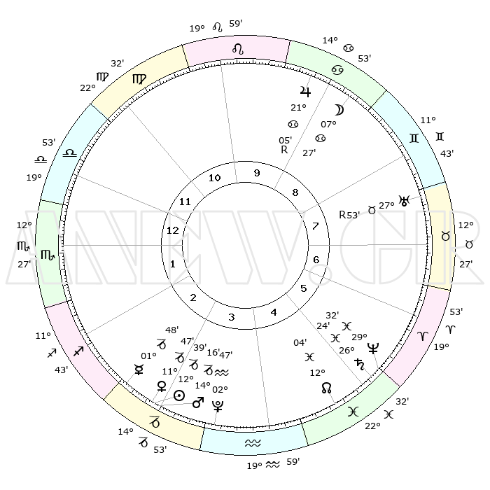 | | ΘΕΣΕΙΣ ΠΛΑΝΗΤΩΝ ΑΣΤΡΟΛΟΓΙΚΟΥ ΧΑΡΤΗ ΤΗΣ ΣΤΙΓΜΗΣ ΑΥΤΗΣ | | | | Πλανήτης | Ζώδιο | Μοίρες | Δεκαήμ. | Σε οίκο | Απόκλιση | | Ακμές των οίκων | | Ηλιος | Αιγόκερως | 12°35' | Δεύτερο | 3 | 22 S 50 | | 1ος | 22°16' | Ζυγός | | Σελήνη | Καρκίνος | 06°25' | Πρώτο | 9 | 27 N 50 | | 2ος | 20°13' | Σκορπιός | | Ερμής | Αιγόκερως | 01°41' | Πρώτο | 3 | 24 S 12 | | 3ος | 21°39' | Τοξότης | | Αφροδίτη | Αιγόκερως | 11°42' | Δεύτερο | 3 | 23 S 30 | | 4ος | 25°21' | Αιγόκερως | | Αρης | Αιγόκερως | 14°13' | Δεύτερο | 3 | 23 S 34 | | 5ος | 28°19' | Υδροχόος | | Δίας | Καρκίνος | 21°06'R | Τρίτο | 9 | 22 N 01 | | 6ος | 27°37' | Ιχθείς | | Κρόνος | Ιχθείς | 26°24' | Τρίτο | 5 | 03 S 30 | | 7ος | 22°16' | Κριός | | Ουρανός | Ταύρος | 27°53'R | Τρίτο | 8 | 19 N 30 | | 8ος | 20°14' | Ταύρος | | Ποσειδώνας | Ιχθείς | 29°32' | Τρίτο | 6 | 01 S 24 | | 9ος | 21°39' | Δίδυμοι | | Πλούτωνας | Υδροχόος | 02°47' | Πρώτο | 4 | 23 S 12 | | 10ος | 25°21' | Καρκίνος | | Β. Δεσμός | Ιχθείς | 12°04' | Δεύτερο | 5 | 07 S 02 | | 11ος | 28°19' | Λέων | | Ωροσκόπος | Ζυγός | 22°16' | Τρίτο | | | 12ος | 27°37' | Παρθένος | | Μεσουράνημα | Καρκίνος | 25°21' | Τρίτο | | | |