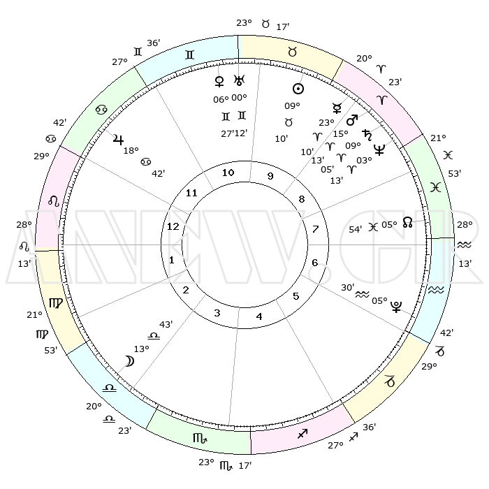 | | ΘΕΣΕΙΣ ΠΛΑΝΗΤΩΝ ΑΣΤΡΟΛΟΓΙΚΟΥ ΧΑΡΤΗ ΤΗΣ ΣΤΙΓΜΗΣ ΑΥΤΗΣ | | | | Πλανήτης | Ζώδιο | Μοίρες | Δεκαήμ. | Σε οίκο | Απόκλιση | | Ακμές των οίκων | | Ηλιος | Ταύρος | 09°08' | Πρώτο | 9 | 14 N 32 | | 1ος | 17°33' | Λέων | | Σελήνη | Ζυγός | 13°15' | Δεύτερο | 3 | 07 S 59 | | 2ος | 10°06' | Παρθένος | | Ερμής | Κριός | 23°06' | Τρίτο | 9 | 07 N 02 | | 3ος | 07°27' | Ζυγός | | Αφροδίτη | Δίδυμοι | 06°24' | Πρώτο | 10 | 22 N 11 | | 4ος | 10°01' | Σκορπιός | | Αρης | Κριός | 15°11' | Δεύτερο | 9 | 05 N 09 | | 5ος | 15°06' | Τοξότης | | Δίας | Καρκίνος | 18°42' | Δεύτερο | 12 | 22 N 31 | | 6ος | 18°17' | Αιγόκερως | | Κρόνος | Κριός | 09°05' | Πρώτο | 9 | 01 N 36 | | 7ος | 17°33' | Υδροχόος | | Ουρανός | Δίδυμοι | 00°11' | Πρώτο | 10 | 20 N 01 | | 8ος | 10°06' | Ιχθείς | | Ποσειδώνας | Κριός | 03°13' | Πρώτο | 8 | 00 N 04 | | 9ος | 07°27' | Κριός | | Πλούτωνας | Υδροχόος | 05°30' | Πρώτο | 6 | 22 S 49 | | 10ος | 10°01' | Ταύρος | | Β. Δεσμός | Ιχθείς | 05°54' | Πρώτο | 7 | 09 S 21 | | 11ος | 15°06' | Δίδυμοι | | Ωροσκόπος | Λέων | 17°33' | Δεύτερο | | | 12ος | 18°17' | Καρκίνος | | Μεσουράνημα | Ταύρος | 10°01' | Δεύτερο | | | |
