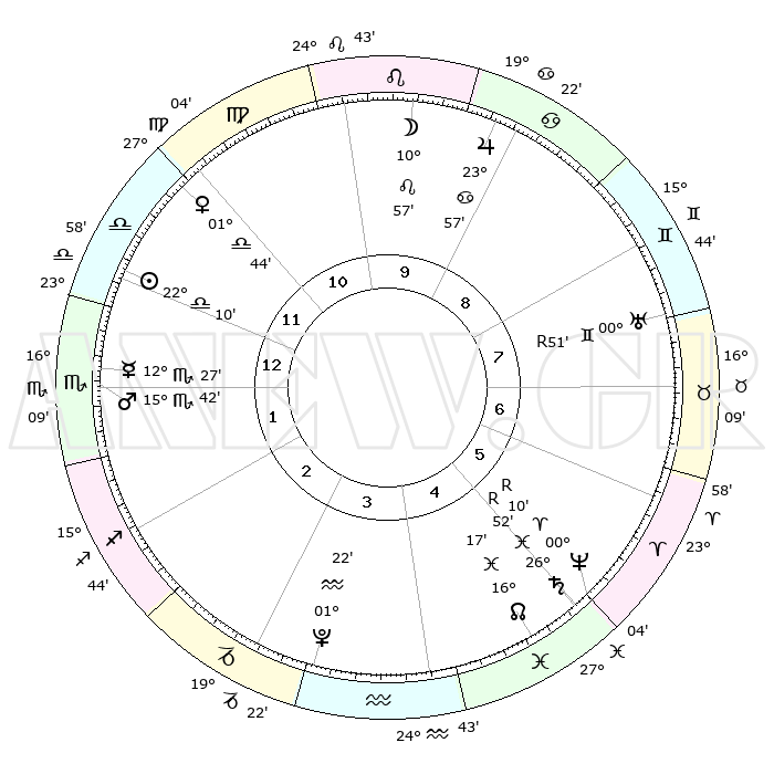 | ΘΕΣΕΙΣ ΠΛΑΝΗΤΩΝ ΑΣΤΡΟΛΟΓΙΚΟΥ ΧΑΡΤΗ ΤΗΣ ΣΤΙΓΜΗΣ ΑΥΤΗΣ | | Πλανήτης | Ζώδιο | Μοίρες | Δεκαήμ. | Σε οίκο | Απόκλιση | | Ακμές των οίκων | Ηλιος | Ζυγός | 21°55' | Τρίτο | 2 | 08 S 32 | | 1ος | 01°57' | Παρθένος | Σελήνη | Λέων | 07°37' | Πρώτο | 12 | 21 N 37 | | 2ος | 26°00' | Παρθένος | Ερμής | Σκορπιός | 12°06' | Δεύτερο | 3 | 17 S 07 | | 3ος | 24°51' | Ζυγός | Αφροδίτη | Ζυγός | 01°25' | Πρώτο | 2 | 00 N 49 | | 4ος | 27°47' | Σκορπιός | Αρης | Σκορπιός | 15°31' | Δεύτερο | 3 | 16 S 42 | | 5ος | 01°50' | Αιγόκερως | Δίας | Καρκίνος | 23°56' | Τρίτο | 11 | 21 N 22 | | 6ος | 03°39' | Υδροχόος | Κρόνος | Ιχθείς | 26°53'R | Τρίτο | 8 | 03 S 32 | | 7ος | 01°57' | Ιχθείς | Ουρανός | Δίδυμοι | 00°51'R | Πρώτο | 10 | 20 N 07 | | 8ος | 26°00' | Ιχθείς | Ποσειδώνας | Κριός | 00°11'R | Πρώτο | 8 | 01 S 11 | | 9ος | 24°51' | Κριός | Πλούτωνας | Υδροχόος | 01°22' | Πρώτο | 5 | 23 S 32 | | 10ος | 27°47' | Ταύρος | Β. Δεσμός | Ιχθείς | 16°18' | Δεύτερο | 7 | 05 S 24 | | 11ος | 01°50' | Καρκίνος | Ωροσκόπος | Παρθένος | 01°57' | Πρώτο | | | 12ος | 03°39' | Λέων | Μεσουράνημα | Ταύρος | 27°47' | Τρίτο | | | |