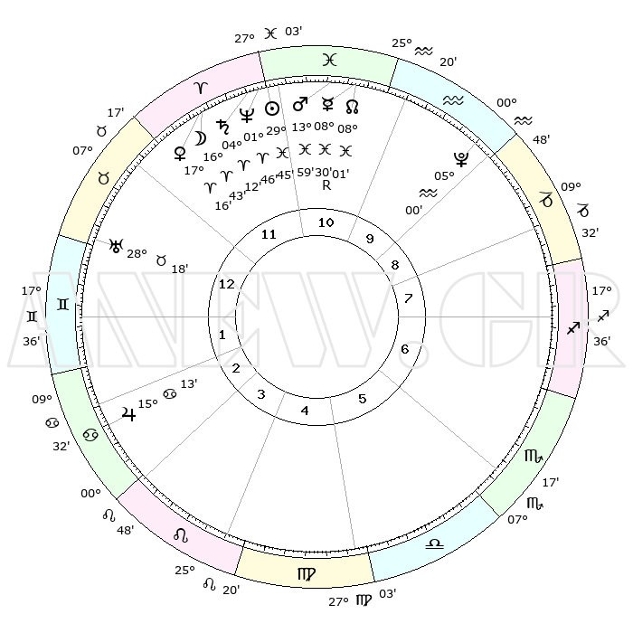 | | ΘΕΣΕΙΣ ΠΛΑΝΗΤΩΝ ΑΣΤΡΟΛΟΓΙΚΟΥ ΧΑΡΤΗ ΤΗΣ ΣΤΙΓΜΗΣ ΑΥΤΗΣ | | | | Πλανήτης | Ζώδιο | Μοίρες | Δεκαήμ. | Σε οίκο | Απόκλιση | | Ακμές των οίκων | | Ηλιος | Ιχθείς | 29°40' | Τρίτο | 11 | 00 S 08 | | 1ος | 16°02' | Ταύρος | | Σελήνη | Κριός | 15°39' | Δεύτερο | 12 | 09 N 03 | | 2ος | 14°00' | Δίδυμοι | | Ερμής | Ιχθείς | 08°30'R | Πρώτο | 11 | 07 S 20 | | 3ος | 06°10' | Καρκίνος | | Αφροδίτη | Κριός | 17°10' | Δεύτερο | 12 | 05 N 56 | | 4ος | 28°10' | Καρκίνος | | Αρης | Ιχθείς | 13°56' | Δεύτερο | 11 | 07 S 19 | | 5ος | 24°28' | Λέων | | Δίας | Καρκίνος | 15°13' | Δεύτερο | 3 | 22 N 55 | | 6ος | 00°23' | Ζυγός | | Κρόνος | Κριός | 04°12' | Πρώτο | 12 | 00 S 17 | | 7ος | 16°02' | Σκορπιός | | Ουρανός | Ταύρος | 28°18' | Τρίτο | 1 | 19 N 36 | | 8ος | 14°00' | Τοξότης | | Ποσειδώνας | Κριός | 01°46' | Πρώτο | 12 | 00 S 30 | | 9ος | 06°10' | Αιγόκερως | | Πλούτωνας | Υδροχόος | 05°00' | Πρώτο | 10 | 22 S 49 | | 10ος | 28°10' | Αιγόκερως | | Β. Δεσμός | Ιχθείς | 08°01' | Πρώτο | 11 | 08 S 33 | | 11ος | 24°28' | Υδροχόος | | Ωροσκόπος | Ταύρος | 16°02' | Δεύτερο | | | 12ος | 00°23' | Κριός | | Μεσουράνημα | Αιγόκερως | 28°10' | Τρίτο | | | |