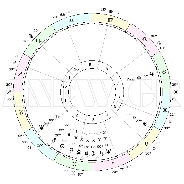 | | ΘΕΣΕΙΣ ΠΛΑΝΗΤΩΝ ΑΣΤΡΟΛΟΓΙΚΟΥ ΧΑΡΤΗ ΤΗΣ ΣΤΙΓΜΗΣ ΑΥΤΗΣ | | | | Πλανήτης | Ζώδιο | Μοίρες | Δεκαήμ. | Σε οίκο | Απόκλιση | | Ακμές των οίκων | | Ηλιος | Ιχθείς | 00°20' | Πρώτο | 3 | 11 S 21 | | 1ος | 02°48' | Τοξότης | | Σελήνη | Ιχθείς | 18°40' | Δεύτερο | 4 | 03 S 39 | | 2ος | 04°19' | Αιγόκερως | | Ερμής | Ιχθείς | 18°24' | Δεύτερο | 4 | 03 S 40 | | 3ος | 10°30' | Υδροχόος | | Αφροδίτη | Ιχθείς | 10°43' | Δεύτερο | 3 | 08 S 54 | | 4ος | 16°35' | Ιχθείς | | Αρης | Υδροχόος | 20°52' | Τρίτο | 3 | 15 S 34 | | 5ος | 17°15' | Κριός | | Δίας | Καρκίνος | 15°45'R | Δεύτερο | 8 | 22 N 50 | | 6ος | 11°56' | Ταύρος | | Κρόνος | Κριός | 00°40' | Πρώτο | 4 | 01 S 42 | | 7ος | 02°48' | Δίδυμοι | | Ουρανός | Ταύρος | 27°33' | Τρίτο | 6 | 19 N 26 | | 8ος | 04°19' | Καρκίνος | | Ποσειδώνας | Κριός | 00°42' | Πρώτο | 4 | 00 S 55 | | 9ος | 10°30' | Λέων | | Πλούτωνας | Υδροχόος | 04°15' | Πρώτο | 2 | 22 S 55 | | 10ος | 16°35' | Παρθένος | | Β. Δεσμός | Ιχθείς | 09°34' | Πρώτο | 3 | 07 S 59 | | 11ος | 17°15' | Ζυγός | | Ωροσκόπος | Τοξότης | 02°48' | Πρώτο | | | 12ος | 11°56' | Σκορπιός | | Μεσουράνημα | Παρθένος | 16°35' | Δεύτερο | | | |