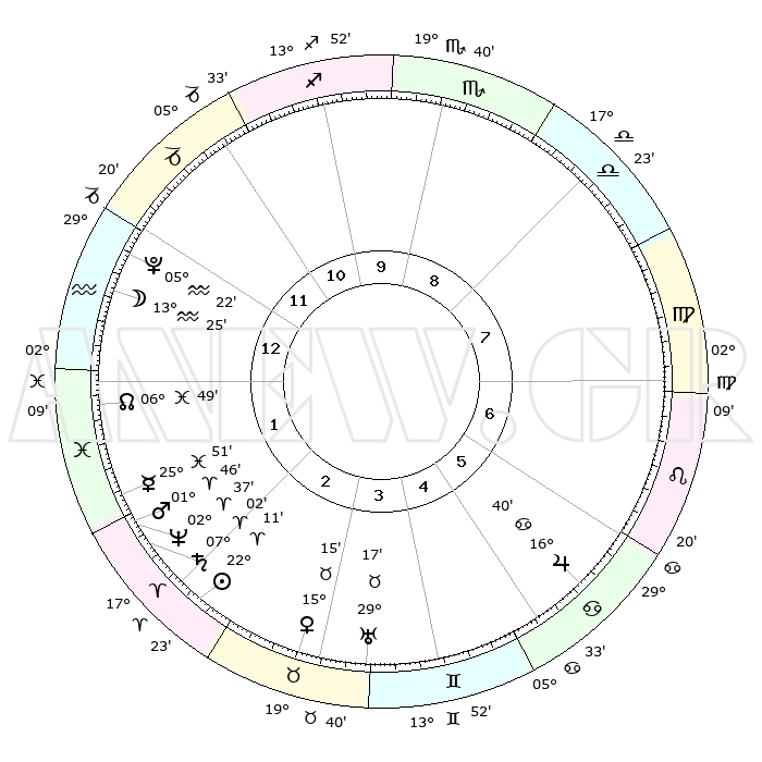 | | ΘΕΣΕΙΣ ΠΛΑΝΗΤΩΝ ΑΣΤΡΟΛΟΓΙΚΟΥ ΧΑΡΤΗ ΤΗΣ ΣΤΙΓΜΗΣ ΑΥΤΗΣ | | | | Πλανήτης | Ζώδιο | Μοίρες | Δεκαήμ. | Σε οίκο | Απόκλιση | | Ακμές των οίκων | | Ηλιος | Κριός | 22°07' | Τρίτο | 3 | 08 N 37 | | 1ος | 28°04' | Αιγόκερως | | Σελήνη | Υδροχόος | 12°32' | Δεύτερο | 1 | 19 S 11 | | 2ος | 11°51' | Ιχθείς | | Ερμής | Ιχθείς | 25°45' | Τρίτο | 2 | 03 S 57 | | 3ος | 20°35' | Κριός | | Αφροδίτη | Ταύρος | 15°10' | Δεύτερο | 3 | 16 N 25 | | 4ος | 19°23' | Ταύρος | | Αρης | Κριός | 01°43' | Πρώτο | 2 | 00 S 14 | | 5ος | 12°17' | Δίδυμοι | | Δίας | Καρκίνος | 16°40' | Δεύτερο | 6 | 22 N 46 | | 6ος | 03°39' | Καρκίνος | | Κρόνος | Κριός | 07°01' | Πρώτο | 2 | 00 N 49 | | 7ος | 28°04' | Καρκίνος | | Ουρανός | Ταύρος | 29°16' | Τρίτο | 4 | 19 N 50 | | 8ος | 11°51' | Παρθένος | | Ποσειδώνας | Κριός | 02°37' | Πρώτο | 2 | 00 S 10 | | 9ος | 20°35' | Ζυγός | | Πλούτωνας | Υδροχόος | 05°22' | Πρώτο | 1 | 22 S 47 | | 10ος | 19°23' | Σκορπιός | | Β. Δεσμός | Ιχθείς | 06°49' | Πρώτο | 1 | 09 S 00 | | 11ος | 12°17' | Τοξότης | | Ωροσκόπος | Αιγόκερως | 28°04' | Τρίτο | | | 12ος | 03°39' | Αιγόκερως | | Μεσουράνημα | Σκορπιός | 19°23' | Δεύτερο | | | |