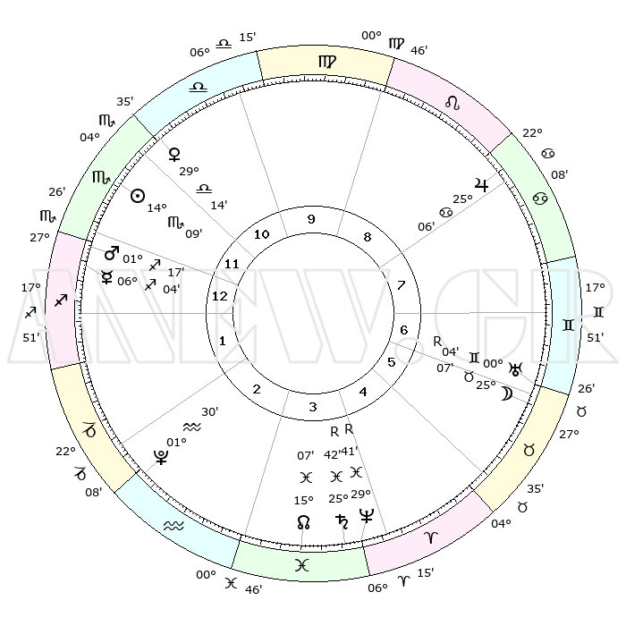 | | ΘΕΣΕΙΣ ΠΛΑΝΗΤΩΝ ΑΣΤΡΟΛΟΓΙΚΟΥ ΧΑΡΤΗ ΤΗΣ ΣΤΙΓΜΗΣ ΑΥΤΗΣ | | | | Πλανήτης | Ζώδιο | Μοίρες | Δεκαήμ. | Σε οίκο | Απόκλιση | | Ακμές των οίκων | | Ηλιος | Σκορπιός | 14°01' | Δεύτερο | 1 | 16 S 03 | | 1ος | 09°13' | Σκορπιός | | Σελήνη | Ταύρος | 23°06' | Τρίτο | 7 | 23 N 02 | | 2ος | 08°14' | Τοξότης | | Ερμής | Τοξότης | 06°00' | Πρώτο | 1 | 24 S 00 | | 3ος | 11°03' | Αιγόκερως | | Αφροδίτη | Ζυγός | 29°04' | Τρίτο | 12 | 09 S 50 | | 4ος | 15°54' | Υδροχόος | | Αρης | Τοξότης | 01°12' | Πρώτο | 1 | 20 S 50 | | 5ος | 18°36' | Ιχθείς | | Δίας | Καρκίνος | 25°06' | Τρίτο | 9 | 21 N 12 | | 6ος | 16°20' | Κριός | | Κρόνος | Ιχθείς | 25°42'R | Τρίτο | 5 | 03 S 57 | | 7ος | 09°13' | Ταύρος | | Ουρανός | Δίδυμοι | 00°04'R | Πρώτο | 7 | 19 N 57 | | 8ος | 08°14' | Δίδυμοι | | Ποσειδώνας | Ιχθείς | 29°41'R | Τρίτο | 5 | 01 S 23 | | 9ος | 11°03' | Καρκίνος | | Πλούτωνας | Υδροχόος | 01°30' | Πρώτο | 3 | 23 S 30 | | 10ος | 15°54' | Λέων | | Β. Δεσμός | Ιχθείς | 15°07' | Δεύτερο | 4 | 05 S 52 | | 11ος | 18°36' | Παρθένος | | Ωροσκόπος | Σκορπιός | 09°13' | Πρώτο | | | 12ος | 16°20' | Ζυγός | | Μεσουράνημα | Λέων | 15°54' | Δεύτερο | | | |