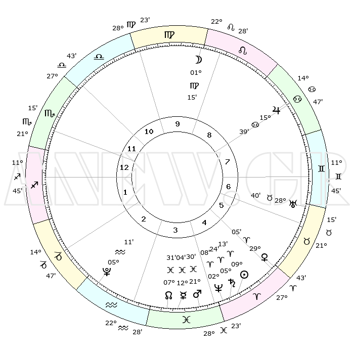 | | ΘΕΣΕΙΣ ΠΛΑΝΗΤΩΝ ΑΣΤΡΟΛΟΓΙΚΟΥ ΧΑΡΤΗ ΤΗΣ ΣΤΙΓΜΗΣ ΑΥΤΗΣ | | | | Πλανήτης | Ζώδιο | Μοίρες | Δεκαήμ. | Σε οίκο | Απόκλιση | | Ακμές των οίκων | | Ηλιος | Κριός | 09°08' | Πρώτο | 5 | 03 N 37 | | 1ος | 18°06' | Σκορπιός | | Σελήνη | Παρθένος | 00°11' | Πρώτο | 10 | 12 N 08 | | 2ος | 17°52' | Τοξότης | | Ερμής | Ιχθείς | 12°00' | Δεύτερο | 4 | 07 S 56 | | 3ος | 21°45' | Αιγόκερως | | Αφροδίτη | Κριός | 28°59' | Τρίτο | 6 | 10 N 37 | | 4ος | 27°14' | Υδροχόος | | Αρης | Ιχθείς | 21°26' | Τρίτο | 4 | 04 S 22 | | 5ος | 29°27' | Ιχθείς | | Δίας | Καρκίνος | 15°39' | Δεύτερο | 8 | 22 N 53 | | 6ος | 26°06' | Κριός | | Κρόνος | Κριός | 05°24' | Πρώτο | 5 | 00 N 11 | | 7ος | 18°06' | Ταύρος | | Ουρανός | Ταύρος | 28°40' | Τρίτο | 7 | 19 N 41 | | 8ος | 17°52' | Δίδυμοι | | Ποσειδώνας | Κριός | 02°08' | Πρώτο | 5 | 00 S 21 | | 9ος | 21°45' | Καρκίνος | | Πλούτωνας | Υδροχόος | 05°11' | Πρώτο | 3 | 22 S 48 | | 10ος | 27°14' | Λέων | | Β. Δεσμός | Ιχθείς | 07°31' | Πρώτο | 4 | 08 S 45 | | 11ος | 29°27' | Παρθένος | | Ωροσκόπος | Σκορπιός | 18°06' | Δεύτερο | | | 12ος | 26°06' | Ζυγός | | Μεσουράνημα | Λέων | 27°14' | Τρίτο | | | |
