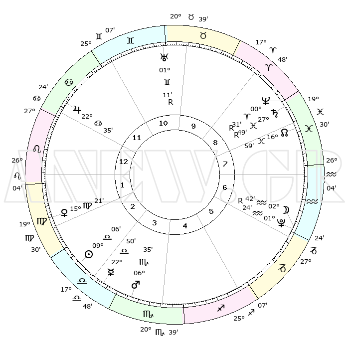 | ΘΕΣΕΙΣ ΠΛΑΝΗΤΩΝ ΑΣΤΡΟΛΟΓΙΚΟΥ ΧΑΡΤΗ ΤΗΣ ΣΤΙΓΜΗΣ ΑΥΤΗΣ | | Πλανήτης | Ζώδιο | Μοίρες | Δεκαήμ. | Σε οίκο | Απόκλιση | | Ακμές των οίκων | Ηλιος | Ζυγός | 09°02' | Πρώτο | 3 | 03 S 35 | | 1ος | 07°09' | Λέων | Σελήνη | Υδροχόος | 01°51' | Πρώτο | 6 | 23 S 27 | | 2ος | 28°44' | Λέων | Ερμής | Ζυγός | 22°44' | Τρίτο | 3 | 09 S 03 | | 3ος | 24°45' | Παρθένος | Αφροδίτη | Παρθένος | 15°17' | Δεύτερο | 2 | 07 N 00 | | 4ος | 26°34' | Ζυγός | Αρης | Σκορπιός | 06°32' | Πρώτο | 4 | 13 S 47 | | 5ος | 02°20' | Τοξότης | Δίας | Καρκίνος | 22°35' | Τρίτο | 12 | 21 N 34 | | 6ος | 06°55' | Αιγόκερως | Κρόνος | Ιχθείς | 27°49'R | Τρίτο | 9 | 03 S 10 | | 7ος | 07°09' | Υδροχόος | Ουρανός | Δίδυμοι | 01°11'R | Πρώτο | 10 | 20 N 11 | | 8ος | 28°44' | Υδροχόος | Ποσειδώνας | Κριός | 00°31'R | Πρώτο | 9 | 01 S 03 | | 9ος | 24°45' | Ιχθείς | Πλούτωνας | Υδροχόος | 01°24'R | Πρώτο | 6 | 23 S 32 | | 10ος | 26°34' | Κριός | Β. Δεσμός | Ιχθείς | 16°59' | Δεύτερο | 8 | 05 S 08 | | 11ος | 02°20' | Δίδυμοι | Ωροσκόπος | Λέων | 07°09' | Πρώτο | | | 12ος | 06°55' | Καρκίνος | Μεσουράνημα | Κριός | 26°34' | Τρίτο | | | |