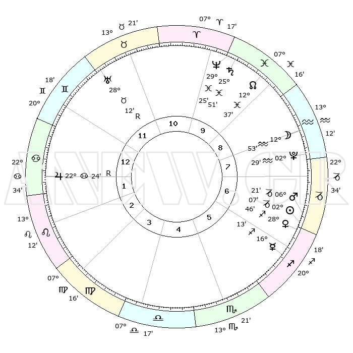 | | ΘΕΣΕΙΣ ΠΛΑΝΗΤΩΝ ΑΣΤΡΟΛΟΓΙΚΟΥ ΧΑΡΤΗ ΤΗΣ ΣΤΙΓΜΗΣ ΑΥΤΗΣ | | | | Πλανήτης | Ζώδιο | Μοίρες | Δεκαήμ. | Σε οίκο | Απόκλιση | | Ακμές των οίκων | | Ηλιος | Αιγόκερως | 02°02' | Πρώτο | 7 | 23 S 25 | | 1ος | 00°06' | Καρκίνος | | Σελήνη | Υδροχόος | 11°59' | Δεύτερο | 8 | 19 S 34 | | 2ος | 20°53' | Καρκίνος | | Ερμής | Τοξότης | 16°07' | Δεύτερο | 6 | 22 S 17 | | 3ος | 12°41' | Λέων | | Αφροδίτη | Τοξότης | 28°41' | Τρίτο | 6 | 23 S 36 | | 4ος | 09°01' | Παρθένος | | Αρης | Αιγόκερως | 06°18' | Πρώτο | 7 | 24 S 07 | | 5ος | 12°58' | Ζυγός | | Δίας | Καρκίνος | 22°24'R | Τρίτο | 2 | 21 N 47 | | 6ος | 22°58' | Σκορπιός | | Κρόνος | Ιχθείς | 25°51' | Τρίτο | 10 | 03 S 45 | | 7ος | 00°06' | Αιγόκερως | | Ουρανός | Ταύρος | 28°12'R | Τρίτο | 12 | 19 N 33 | | 8ος | 20°53' | Αιγόκερως | | Ποσειδώνας | Ιχθείς | 29°25' | Τρίτο | 10 | 01 S 27 | | 9ος | 12°41' | Υδροχόος | | Πλούτωνας | Υδροχόος | 02°29' | Πρώτο | 8 | 23 S 16 | | 10ος | 09°01' | Ιχθείς | | Β. Δεσμός | Ιχθείς | 12°37' | Δεύτερο | 10 | 06 S 50 | | 11ος | 12°58' | Κριός | | Ωροσκόπος | Καρκίνος | 00°06' | Πρώτο | | | 12ος | 22°58' | Ταύρος | | Μεσουράνημα | Ιχθείς | 09°01' | Πρώτο | | | |