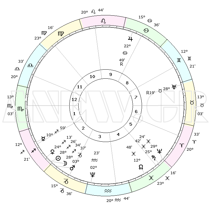 | | ΘΕΣΕΙΣ ΠΛΑΝΗΤΩΝ ΑΣΤΡΟΛΟΓΙΚΟΥ ΧΑΡΤΗ ΤΗΣ ΣΤΙΓΜΗΣ ΑΥΤΗΣ | | | | Πλανήτης | Ζώδιο | Μοίρες | Δεκαήμ. | Σε οίκο | Απόκλιση | | Ακμές των οίκων | | Ηλιος | Τοξότης | 28°22' | Τρίτο | 3 | 23 S 25 | | 1ος | 23°16' | Ζυγός | | Σελήνη | Τοξότης | 27°45' | Τρίτο | 3 | 28 S 14 | | 2ος | 21°17' | Σκορπιός | | Ερμής | Τοξότης | 10°53' | Δεύτερο | 2 | 21 S 11 | | 3ος | 22°46' | Τοξότης | | Αφροδίτη | Τοξότης | 24°08' | Τρίτο | 3 | 23 S 20 | | 4ος | 26°32' | Αιγόκερως | | Αρης | Αιγόκερως | 03°34' | Πρώτο | 3 | 24 S 12 | | 5ος | 29°30' | Υδροχόος | | Δίας | Καρκίνος | 22°50'R | Τρίτο | 9 | 21 N 42 | | 6ος | 28°43' | Ιχθείς | | Κρόνος | Ιχθείς | 25°42' | Τρίτο | 5 | 03 S 49 | | 7ος | 23°16' | Κριός | | Ουρανός | Ταύρος | 28°19'R | Τρίτο | 8 | 19 N 35 | | 8ος | 21°17' | Ταύρος | | Ποσειδώνας | Ιχθείς | 29°24' | Τρίτο | 6 | 01 S 28 | | 9ος | 22°46' | Δίδυμοι | | Πλούτωνας | Υδροχόος | 02°23' | Πρώτο | 4 | 23 S 18 | | 10ος | 26°32' | Καρκίνος | | Β. Δεσμός | Ιχθείς | 12°48' | Δεύτερο | 5 | 06 S 45 | | 11ος | 29°30' | Λέων | | Ωροσκόπος | Ζυγός | 23°16' | Τρίτο | | | 12ος | 28°43' | Παρθένος | | Μεσουράνημα | Καρκίνος | 26°32' | Τρίτο | | | |