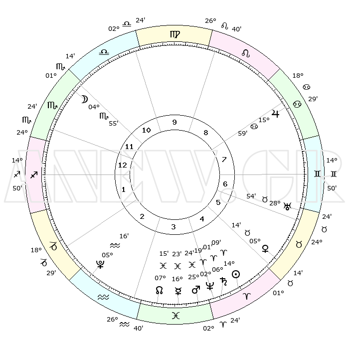 | | ΘΕΣΕΙΣ ΠΛΑΝΗΤΩΝ ΑΣΤΡΟΛΟΓΙΚΟΥ ΧΑΡΤΗ ΤΗΣ ΣΤΙΓΜΗΣ ΑΥΤΗΣ | | | | Πλανήτης | Ζώδιο | Μοίρες | Δεκαήμ. | Σε οίκο | Απόκλιση | | Ακμές των οίκων | | Ηλιος | Κριός | 14°05' | Δεύτερο | 5 | 05 N 33 | | 1ος | 26°30' | Σκορπιός | | Σελήνη | Σκορπιός | 04°09' | Πρώτο | 11 | 16 S 55 | | 2ος | 27°10' | Τοξότης | | Ερμής | Ιχθείς | 16°19' | Δεύτερο | 4 | 06 S 59 | | 3ος | 02°18' | Υδροχόος | | Αφροδίτη | Ταύρος | 05°09' | Πρώτο | 5 | 12 N 56 | | 4ος | 08°14' | Ιχθείς | | Αρης | Ιχθείς | 25°21' | Τρίτο | 4 | 02 S 48 | | 5ος | 09°41' | Κριός | | Δίας | Καρκίνος | 15°59' | Δεύτερο | 8 | 22 N 51 | | 6ος | 05°12' | Ταύρος | | Κρόνος | Κριός | 06°01' | Πρώτο | 4 | 00 N 26 | | 7ος | 26°30' | Ταύρος | | Ουρανός | Ταύρος | 28°53' | Τρίτο | 7 | 19 N 44 | | 8ος | 27°10' | Δίδυμοι | | Ποσειδώνας | Κριός | 02°19' | Πρώτο | 4 | 00 S 17 | | 9ος | 02°18' | Λέων | | Πλούτωνας | Υδροχόος | 05°16' | Πρώτο | 3 | 22 S 47 | | 10ος | 08°14' | Παρθένος | | Β. Δεσμός | Ιχθείς | 07°15' | Πρώτο | 3 | 08 S 51 | | 11ος | 09°41' | Ζυγός | | Ωροσκόπος | Σκορπιός | 26°30' | Τρίτο | | | 12ος | 05°12' | Σκορπιός | | Μεσουράνημα | Παρθένος | 08°14' | Πρώτο | | | |