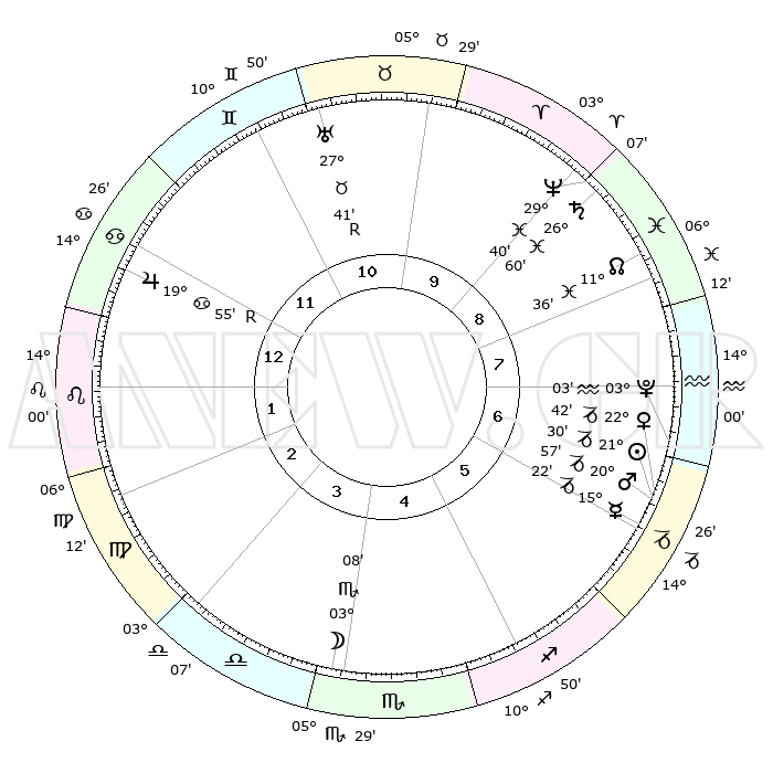 | | ΘΕΣΕΙΣ ΠΛΑΝΗΤΩΝ ΑΣΤΡΟΛΟΓΙΚΟΥ ΧΑΡΤΗ ΤΗΣ ΣΤΙΓΜΗΣ ΑΥΤΗΣ | | | | Πλανήτης | Ζώδιο | Μοίρες | Δεκαήμ. | Σε οίκο | Απόκλιση | | Ακμές των οίκων | | Ηλιος | Αιγόκερως | 21°10' | Τρίτο | 10 | 21 S 46 | | 1ος | 11°35' | Κριός | | Σελήνη | Ζυγός | 29°17' | Τρίτο | 7 | 14 S 50 | | 2ος | 18°54' | Ταύρος | | Ερμής | Αιγόκερως | 14°51' | Δεύτερο | 10 | 24 S 08 | | 3ος | 14°38' | Δίδυμοι | | Αφροδίτη | Αιγόκερως | 22°18' | Τρίτο | 10 | 22 S 27 | | 4ος | 06°32' | Καρκίνος | | Αρης | Αιγόκερως | 20°42' | Τρίτο | 10 | 22 S 47 | | 5ος | 29°28' | Καρκίνος | | Δίας | Καρκίνος | 19°58'R | Δεύτερο | 4 | 22 N 13 | | 6ος | 28°45' | Λέων | | Κρόνος | Ιχθείς | 26°58' | Τρίτο | 12 | 03 S 15 | | 7ος | 11°35' | Ζυγός | | Ουρανός | Ταύρος | 27°42'R | Τρίτο | 2 | 19 N 27 | | 8ος | 18°54' | Σκορπιός | | Ποσειδώνας | Ιχθείς | 29°40' | Τρίτο | 12 | 01 S 21 | | 9ος | 14°38' | Τοξότης | | Πλούτωνας | Υδροχόος | 03°03' | Πρώτο | 11 | 23 S 09 | | 10ος | 06°32' | Αιγόκερως | | Β. Δεσμός | Ιχθείς | 11°37' | Δεύτερο | 12 | 07 S 12 | | 11ος | 29°28' | Αιγόκερως | | Ωροσκόπος | Κριός | 11°35' | Δεύτερο | | | 12ος | 28°45' | Υδροχόος | | Μεσουράνημα | Αιγόκερως | 06°32' | Πρώτο | | | |