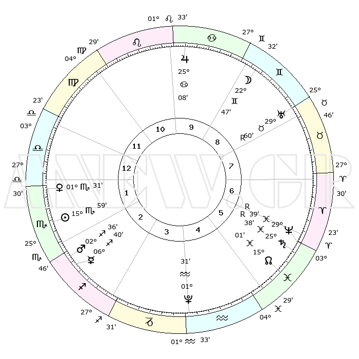 | | ΘΕΣΕΙΣ ΠΛΑΝΗΤΩΝ ΑΣΤΡΟΛΟΓΙΚΟΥ ΧΑΡΤΗ ΤΗΣ ΣΤΙΓΜΗΣ ΑΥΤΗΣ | | | | Πλανήτης | Ζώδιο | Μοίρες | Δεκαήμ. | Σε οίκο | Απόκλιση | | Ακμές των οίκων | | Ηλιος | Σκορπιός | 15°47' | Δεύτερο | 3 | 16 S 34 | | 1ος | 01°37' | Παρθένος | | Σελήνη | Δίδυμοι | 19°56' | Δεύτερο | 10 | 28 N 06 | | 2ος | 25°38' | Παρθένος | | Ερμής | Τοξότης | 06°38' | Πρώτο | 4 | 23 S 58 | | 3ος | 24°27' | Ζυγός | | Αφροδίτη | Σκορπιός | 01°17' | Πρώτο | 3 | 10 S 38 | | 4ος | 27°23' | Σκορπιός | | Αρης | Τοξότης | 02°28' | Πρώτο | 4 | 21 S 06 | | 5ος | 01°28' | Αιγόκερως | | Δίας | Καρκίνος | 25°08' | Τρίτο | 11 | 21 N 12 | | 6ος | 03°18' | Υδροχόος | | Κρόνος | Ιχθείς | 25°39'R | Τρίτο | 8 | 03 S 59 | | 7ος | 01°37' | Ιχθείς | | Ουρανός | Δίδυμοι | 00°00'R | Πρώτο | 10 | 19 N 56 | | 8ος | 25°38' | Ιχθείς | | Ποσειδώνας | Ιχθείς | 29°40'R | Τρίτο | 8 | 01 S 23 | | 9ος | 24°27' | Κριός | | Πλούτωνας | Υδροχόος | 01°31' | Πρώτο | 5 | 23 S 30 | | 10ος | 27°23' | Ταύρος | | Β. Δεσμός | Ιχθείς | 15°02' | Δεύτερο | 7 | 05 S 54 | | 11ος | 01°28' | Καρκίνος | | Ωροσκόπος | Παρθένος | 01°37' | Πρώτο | | | 12ος | 03°18' | Λέων | | Μεσουράνημα | Ταύρος | 27°23' | Τρίτο | | | |