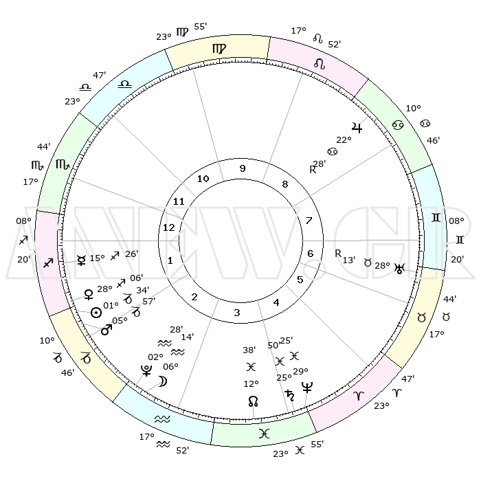 | | ΘΕΣΕΙΣ ΠΛΑΝΗΤΩΝ ΑΣΤΡΟΛΟΓΙΚΟΥ ΧΑΡΤΗ ΤΗΣ ΣΤΙΓΜΗΣ ΑΥΤΗΣ | | | | Πλανήτης | Ζώδιο | Μοίρες | Δεκαήμ. | Σε οίκο | Απόκλιση | | Ακμές των οίκων | | Ηλιος | Αιγόκερως | 01°29' | Πρώτο | 2 | 23 S 25 | | 1ος | 15°49' | Σκορπιός | | Σελήνη | Υδροχόος | 05°16' | Πρώτο | 3 | 21 S 50 | | 2ος | 15°22' | Τοξότης | | Ερμής | Τοξότης | 15°19' | Δεύτερο | 1 | 22 S 08 | | 3ος | 18°57' | Αιγόκερως | | Αφροδίτη | Τοξότης | 27°60' | Τρίτο | 2 | 23 S 35 | | 4ος | 24°17' | Υδροχόος | | Αρης | Αιγόκερως | 05°54' | Πρώτο | 2 | 24 S 08 | | 5ος | 26°39' | Ιχθείς | | Δίας | Καρκίνος | 22°28'R | Τρίτο | 9 | 21 N 46 | | 6ος | 23°35' | Κριός | | Κρόνος | Ιχθείς | 25°50' | Τρίτο | 4 | 03 S 46 | | 7ος | 15°49' | Ταύρος | | Ουρανός | Ταύρος | 28°13'R | Τρίτο | 7 | 19 N 34 | | 8ος | 15°22' | Δίδυμοι | | Ποσειδώνας | Ιχθείς | 29°25' | Τρίτο | 5 | 01 S 28 | | 9ος | 18°57' | Καρκίνος | | Πλούτωνας | Υδροχόος | 02°28' | Πρώτο | 3 | 23 S 16 | | 10ος | 24°17' | Λέων | | Β. Δεσμός | Ιχθείς | 12°38' | Δεύτερο | 4 | 06 S 49 | | 11ος | 26°39' | Παρθένος | | Ωροσκόπος | Σκορπιός | 15°49' | Δεύτερο | | | 12ος | 23°35' | Ζυγός | | Μεσουράνημα | Λέων | 24°17' | Τρίτο | | | |