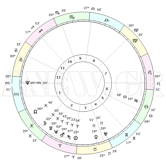 | | ΘΕΣΕΙΣ ΠΛΑΝΗΤΩΝ ΑΣΤΡΟΛΟΓΙΚΟΥ ΧΑΡΤΗ ΤΗΣ ΣΤΙΓΜΗΣ ΑΥΤΗΣ | | | | Πλανήτης | Ζώδιο | Μοίρες | Δεκαήμ. | Σε οίκο | Απόκλιση | | Ακμές των οίκων | | Ηλιος | Κριός | 25°00' | Τρίτο | 3 | 09 N 41 | | 1ος | 10°35' | Αιγόκερως | | Σελήνη | Ιχθείς | 21°13' | Τρίτο | 2 | 02 S 24 | | 2ος | 20°26' | Υδροχόος | | Ερμής | Ιχθείς | 29°45' | Τρίτο | 2 | 02 S 29 | | 3ος | 00°43' | Κριός | | Αφροδίτη | Ταύρος | 18°46' | Δεύτερο | 4 | 17 N 34 | | 4ος | 02°47' | Ταύρος | | Αρης | Κριός | 04°00' | Πρώτο | 3 | 00 N 41 | | 5ος | 27°33' | Ταύρος | | Δίας | Καρκίνος | 16°58' | Δεύτερο | 7 | 22 N 44 | | 6ος | 18°52' | Δίδυμοι | | Κρόνος | Κριός | 07°23' | Πρώτο | 3 | 00 N 57 | | 7ος | 10°35' | Καρκίνος | | Ουρανός | Ταύρος | 29°25' | Τρίτο | 5 | 19 N 51 | | 8ος | 20°26' | Λέων | | Ποσειδώνας | Κριός | 02°43' | Πρώτο | 3 | 00 S 07 | | 9ος | 00°43' | Ζυγός | | Πλούτωνας | Υδροχόος | 05°24' | Πρώτο | 1 | 22 S 47 | | 10ος | 02°47' | Σκορπιός | | Β. Δεσμός | Ιχθείς | 06°40' | Πρώτο | 2 | 09 S 04 | | 11ος | 27°33' | Σκορπιός | | Ωροσκόπος | Αιγόκερως | 10°35' | Δεύτερο | | | 12ος | 18°52' | Τοξότης | | Μεσουράνημα | Σκορπιός | 02°47' | Πρώτο | | | |