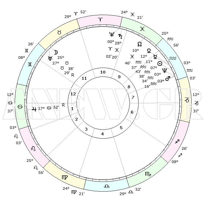 | | ΘΕΣΕΙΣ ΠΛΑΝΗΤΩΝ ΑΣΤΡΟΛΟΓΙΚΟΥ ΧΑΡΤΗ ΤΗΣ ΣΤΙΓΜΗΣ ΑΥΤΗΣ | | | | Πλανήτης | Ζώδιο | Μοίρες | Δεκαήμ. | Σε οίκο | Απόκλιση | | Ακμές των οίκων | | Ηλιος | Υδροχόος | 07°33' | Πρώτο | 9 | 18 S 23 | | 1ος | 20°14' | Δίδυμοι | | Σελήνη | Ταύρος | 24°40' | Τρίτο | 12 | 23 N 48 | | 2ος | 11°52' | Καρκίνος | | Ερμής | Υδροχόος | 11°36' | Δεύτερο | 9 | 19 S 17 | | 3ος | 03°12' | Λέων | | Αφροδίτη | Υδροχόος | 12°32' | Δεύτερο | 9 | 18 S 16 | | 4ος | 28°04' | Λέων | | Αρης | Υδροχόος | 03°13' | Πρώτο | 9 | 20 S 26 | | 5ος | 00°18' | Ζυγός | | Δίας | Καρκίνος | 17°53'R | Δεύτερο | 2 | 22 N 32 | | 6ος | 10°35' | Σκορπιός | | Κρόνος | Ιχθείς | 28°19' | Τρίτο | 10 | 02 S 40 | | 7ος | 20°14' | Τοξότης | | Ουρανός | Ταύρος | 27°29'R | Τρίτο | 12 | 19 N 24 | | 8ος | 11°52' | Αιγόκερως | | Ποσειδώνας | Κριός | 00°01' | Πρώτο | 10 | 01 S 12 | | 9ος | 03°12' | Υδροχόος | | Πλούτωνας | Υδροχόος | 03°33' | Πρώτο | 9 | 23 S 03 | | 10ος | 28°04' | Υδροχόος | | Β. Δεσμός | Ιχθείς | 10°46' | Δεύτερο | 10 | 07 S 32 | | 11ος | 00°18' | Κριός | | Ωροσκόπος | Δίδυμοι | 20°14' | Τρίτο | | | 12ος | 10°35' | Ταύρος | | Μεσουράνημα | Υδροχόος | 28°04' | Τρίτο | | | |