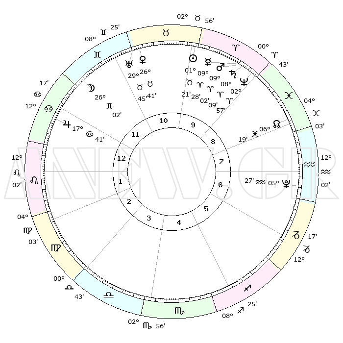 | | ΘΕΣΕΙΣ ΠΛΑΝΗΤΩΝ ΑΣΤΡΟΛΟΓΙΚΟΥ ΧΑΡΤΗ ΤΗΣ ΣΤΙΓΜΗΣ ΑΥΤΗΣ | | | | Πλανήτης | Ζώδιο | Μοίρες | Δεκαήμ. | Σε οίκο | Απόκλιση | | Ακμές των οίκων | | Ηλιος | Ταύρος | 01°17' | Πρώτο | 10 | 11 N 55 | | 1ος | 23°60' | Καρκίνος | | Σελήνη | Δίδυμοι | 25°08' | Τρίτο | 12 | 28 N 12 | | 2ος | 14°41' | Λέων | | Ερμής | Κριός | 09°22' | Πρώτο | 10 | 01 N 20 | | 3ος | 08°56' | Παρθένος | | Αφροδίτη | Ταύρος | 26°37' | Τρίτο | 11 | 19 N 51 | | 4ος | 09°09' | Ζυγός | | Αρης | Κριός | 08°59' | Πρώτο | 9 | 02 N 41 | | 5ος | 15°15' | Σκορπιός | | Δίας | Καρκίνος | 17°40' | Δεύτερο | 12 | 22 N 39 | | 6ος | 21°58' | Τοξότης | | Κρόνος | Κριός | 08°09' | Πρώτο | 9 | 01 N 15 | | 7ος | 23°60' | Αιγόκερως | | Ουρανός | Ταύρος | 29°45' | Τρίτο | 11 | 19 N 56 | | 8ος | 14°41' | Υδροχόος | | Ποσειδώνας | Κριός | 02°57' | Πρώτο | 9 | 00 S 02 | | 9ος | 08°56' | Ιχθείς | | Πλούτωνας | Υδροχόος | 05°27' | Πρώτο | 7 | 22 S 48 | | 10ος | 09°09' | Κριός | | Β. Δεσμός | Ιχθείς | 06°19' | Πρώτο | 8 | 09 S 11 | | 11ος | 15°15' | Ταύρος | | Ωροσκόπος | Καρκίνος | 23°60' | Τρίτο | | | 12ος | 21°58' | Δίδυμοι | | Μεσουράνημα | Κριός | 09°09' | Πρώτο | | | |