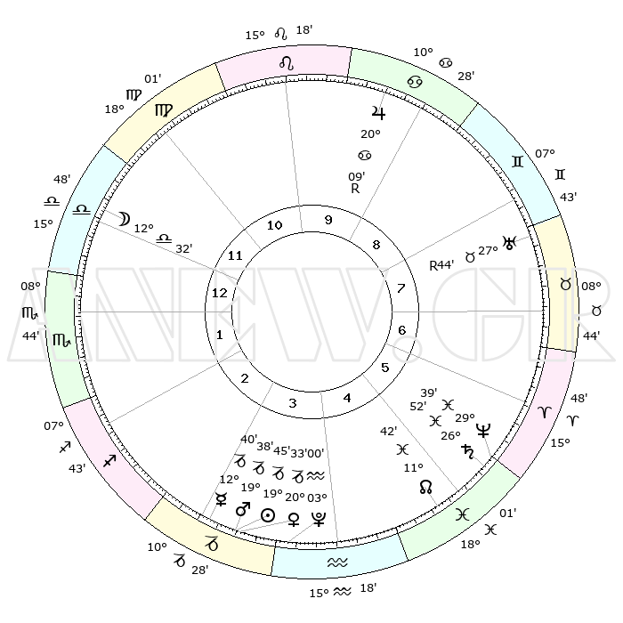 | | ΘΕΣΕΙΣ ΠΛΑΝΗΤΩΝ ΑΣΤΡΟΛΟΓΙΚΟΥ ΧΑΡΤΗ ΤΗΣ ΣΤΙΓΜΗΣ ΑΥΤΗΣ | | | | Πλανήτης | Ζώδιο | Μοίρες | Δεκαήμ. | Σε οίκο | Απόκλιση | | Ακμές των οίκων | | Ηλιος | Αιγόκερως | 19°05' | Δεύτερο | 11 | 22 S 04 | | 1ος | 16°46' | Ιχθείς | | Σελήνη | Ζυγός | 04°28' | Πρώτο | 7 | 03 S 42 | | 2ος | 29°55' | Κριός | | Ερμής | Αιγόκερως | 11°38' | Δεύτερο | 10 | 24 S 18 | | 3ος | 29°30' | Ταύρος | | Αφροδίτη | Αιγόκερως | 19°44' | Δεύτερο | 11 | 22 S 46 | | 4ος | 22°31' | Δίδυμοι | | Αρης | Αιγόκερως | 19°08' | Δεύτερο | 11 | 23 S 00 | | 5ος | 14°23' | Καρκίνος | | Δίας | Καρκίνος | 20°14'R | Τρίτο | 5 | 22 N 10 | | 6ος | 09°54' | Λέων | | Κρόνος | Ιχθείς | 26°49' | Τρίτο | 1 | 03 S 19 | | 7ος | 16°46' | Παρθένος | | Ουρανός | Ταύρος | 27°44'R | Τρίτο | 2 | 19 N 28 | | 8ος | 29°55' | Ζυγός | | Ποσειδώνας | Ιχθείς | 29°38' | Τρίτο | 1 | 01 S 22 | | 9ος | 29°30' | Σκορπιός | | Πλούτωνας | Υδροχόος | 02°59' | Πρώτο | 11 | 23 S 10 | | 10ος | 22°31' | Τοξότης | | Β. Δεσμός | Ιχθείς | 11°44' | Δεύτερο | 12 | 07 S 10 | | 11ος | 14°23' | Αιγόκερως | | Ωροσκόπος | Ιχθείς | 16°46' | Δεύτερο | | | 12ος | 09°54' | Υδροχόος | | Μεσουράνημα | Τοξότης | 22°31' | Τρίτο | | | |