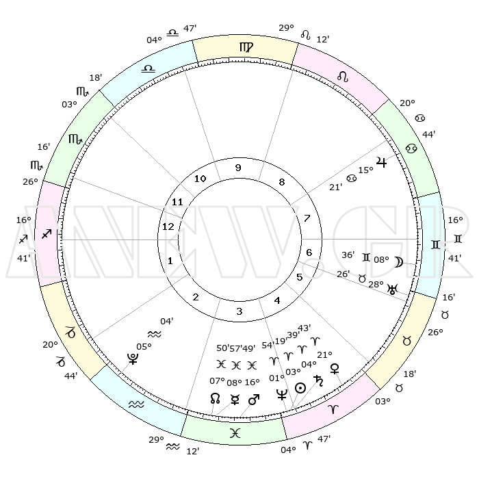 | | ΘΕΣΕΙΣ ΠΛΑΝΗΤΩΝ ΑΣΤΡΟΛΟΓΙΚΟΥ ΧΑΡΤΗ ΤΗΣ ΣΤΙΓΜΗΣ ΑΥΤΗΣ | | | | Πλανήτης | Ζώδιο | Μοίρες | Δεκαήμ. | Σε οίκο | Απόκλιση | | Ακμές των οίκων | | Ηλιος | Κριός | 03°14' | Πρώτο | 4 | 01 N 17 | | 1ος | 25°38' | Σκορπιός | | Σελήνη | Δίδυμοι | 07°35' | Πρώτο | 7 | 26 N 43 | | 2ος | 26°12' | Τοξότης | | Ερμής | Ιχθείς | 08°56' | Πρώτο | 4 | 07 S 58 | | 3ος | 01°12' | Υδροχόος | | Αφροδίτη | Κριός | 21°37' | Τρίτο | 5 | 07 N 43 | | 4ος | 07°06' | Ιχθείς | | Αρης | Ιχθείς | 16°45' | Δεύτερο | 4 | 06 S 13 | | 5ος | 08°39' | Κριός | | Δίας | Καρκίνος | 15°21' | Δεύτερο | 8 | 22 N 55 | | 6ος | 04°17' | Ταύρος | | Κρόνος | Κριός | 04°39' | Πρώτο | 4 | 00 S 06 | | 7ος | 25°38' | Ταύρος | | Ουρανός | Ταύρος | 28°26' | Τρίτο | 7 | 19 N 38 | | 8ος | 26°12' | Δίδυμοι | | Ποσειδώνας | Κριός | 01°54' | Πρώτο | 4 | 00 S 27 | | 9ος | 01°12' | Λέων | | Πλούτωνας | Υδροχόος | 05°04' | Πρώτο | 3 | 22 S 48 | | 10ος | 07°06' | Παρθένος | | Β. Δεσμός | Ιχθείς | 07°50' | Πρώτο | 4 | 08 S 38 | | 11ος | 08°39' | Ζυγός | | Ωροσκόπος | Σκορπιός | 25°38' | Τρίτο | | | 12ος | 04°17' | Σκορπιός | | Μεσουράνημα | Παρθένος | 07°06' | Πρώτο | | | |