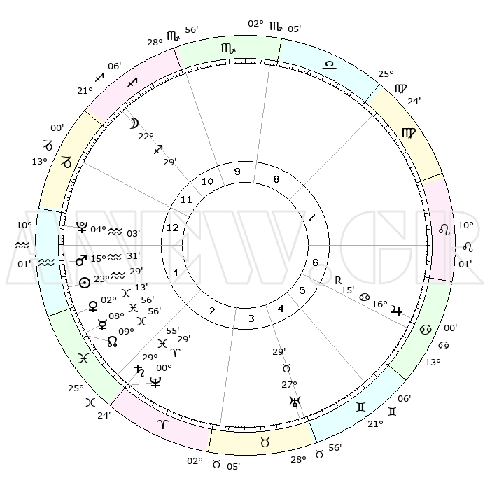 | | ΘΕΣΕΙΣ ΠΛΑΝΗΤΩΝ ΑΣΤΡΟΛΟΓΙΚΟΥ ΧΑΡΤΗ ΤΗΣ ΣΤΙΓΜΗΣ ΑΥΤΗΣ | | | | Πλανήτης | Ζώδιο | Μοίρες | Δεκαήμ. | Σε οίκο | Απόκλιση | | Ακμές των οίκων | | Ηλιος | Υδροχόος | 23°25' | Τρίτο | 1 | 13 S 43 | | 1ος | 16°30' | Αιγόκερως | | Σελήνη | Τοξότης | 21°48' | Τρίτο | 11 | 28 S 18 | | 2ος | 27°50' | Υδροχόος | | Ερμής | Ιχθείς | 08°51' | Πρώτο | 2 | 08 S 45 | | 3ος | 07°51' | Κριός | | Αφροδίτη | Ιχθείς | 02°09' | Πρώτο | 2 | 12 S 04 | | 4ος | 08°47' | Ταύρος | | Αρης | Υδροχόος | 15°29' | Δεύτερο | 1 | 17 S 13 | | 5ος | 02°49' | Δίδυμοι | | Δίας | Καρκίνος | 16°15'R | Δεύτερο | 6 | 22 N 46 | | 6ος | 24°02' | Δίδυμοι | | Κρόνος | Ιχθείς | 29°55' | Τρίτο | 2 | 02 S 01 | | 7ος | 16°30' | Καρκίνος | | Ουρανός | Ταύρος | 27°29' | Τρίτο | 4 | 19 N 25 | | 8ος | 27°50' | Λέων | | Ποσειδώνας | Κριός | 00°29' | Πρώτο | 2 | 01 S 01 | | 9ος | 07°51' | Ζυγός | | Πλούτωνας | Υδροχόος | 04°03' | Πρώτο | 1 | 22 S 57 | | 10ος | 08°47' | Σκορπιός | | Β. Δεσμός | Ιχθείς | 09°56' | Πρώτο | 2 | 07 S 50 | | 11ος | 02°49' | Τοξότης | | Ωροσκόπος | Αιγόκερως | 16°30' | Δεύτερο | | | 12ος | 24°02' | Τοξότης | | Μεσουράνημα | Σκορπιός | 08°47' | Πρώτο | | | |