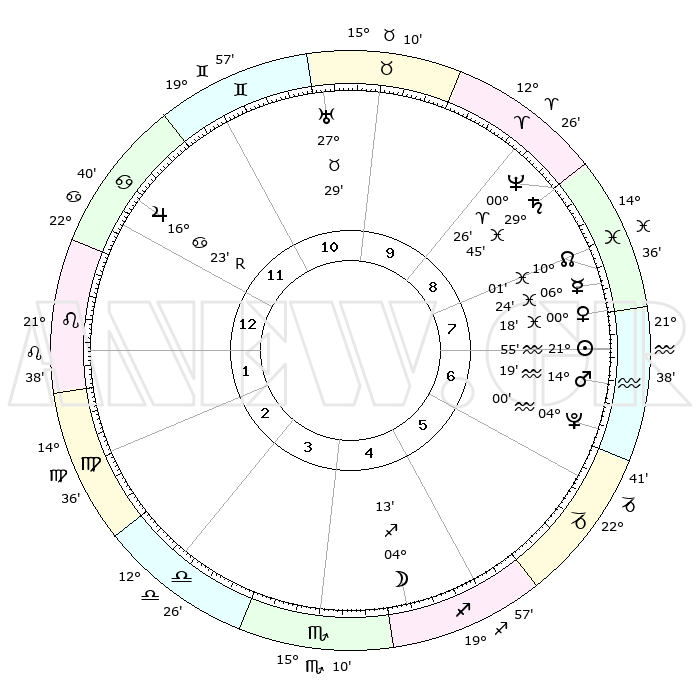 | | ΘΕΣΕΙΣ ΠΛΑΝΗΤΩΝ ΑΣΤΡΟΛΟΓΙΚΟΥ ΧΑΡΤΗ ΤΗΣ ΣΤΙΓΜΗΣ ΑΥΤΗΣ | | | | Πλανήτης | Ζώδιο | Μοίρες | Δεκαήμ. | Σε οίκο | Απόκλιση | | Ακμές των οίκων | | Ηλιος | Υδροχόος | 21°52' | Τρίτο | 7 | 14 S 13 | | 1ος | 07°46' | Λέων | | Σελήνη | Τοξότης | 03°39' | Πρώτο | 5 | 26 S 01 | | 2ος | 29°24' | Λέων | | Ερμής | Ιχθείς | 06°20' | Πρώτο | 8 | 09 S 56 | | 3ος | 25°30' | Παρθένος | | Αφροδίτη | Ιχθείς | 00°14' | Πρώτο | 8 | 12 S 45 | | 4ος | 27°22' | Ζυγός | | Αρης | Υδροχόος | 14°17' | Δεύτερο | 7 | 17 S 34 | | 5ος | 03°06' | Τοξότης | | Δίας | Καρκίνος | 16°23'R | Δεύτερο | 12 | 22 N 45 | | 6ος | 07°35' | Αιγόκερως | | Κρόνος | Ιχθείς | 29°45' | Τρίτο | 9 | 02 S 05 | | 7ος | 07°46' | Υδροχόος | | Ουρανός | Ταύρος | 27°29' | Τρίτο | 10 | 19 N 25 | | 8ος | 29°24' | Υδροχόος | | Ποσειδώνας | Κριός | 00°26' | Πρώτο | 9 | 01 S 02 | | 9ος | 25°30' | Ιχθείς | | Πλούτωνας | Υδροχόος | 04°00' | Πρώτο | 6 | 22 S 58 | | 10ος | 27°22' | Κριός | | Β. Δεσμός | Ιχθείς | 10°01' | Δεύτερο | 8 | 07 S 49 | | 11ος | 03°06' | Δίδυμοι | | Ωροσκόπος | Λέων | 07°46' | Πρώτο | | | 12ος | 07°35' | Καρκίνος | | Μεσουράνημα | Κριός | 27°22' | Τρίτο | | | |