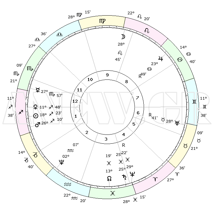 | | ΘΕΣΕΙΣ ΠΛΑΝΗΤΩΝ ΑΣΤΡΟΛΟΓΙΚΟΥ ΧΑΡΤΗ ΤΗΣ ΣΤΙΓΜΗΣ ΑΥΤΗΣ | | | | Πλανήτης | Ζώδιο | Μοίρες | Δεκαήμ. | Σε οίκο | Απόκλιση | | Ακμές των οίκων | | Ηλιος | Τοξότης | 18°21' | Δεύτερο | 1 | 22 S 55 | | 1ος | 29°06' | Σκορπιός | | Σελήνη | Λέων | 28°12' | Τρίτο | 9 | 13 N 19 | | 2ος | 00°06' | Αιγόκερως | | Ερμής | Σκορπιός | 27°54' | Τρίτο | 12 | 17 S 38 | | 3ος | 05°39' | Υδροχόος | | Αφροδίτη | Τοξότης | 11°44' | Δεύτερο | 1 | 21 S 50 | | 4ος | 11°41' | Ιχθείς | | Αρης | Τοξότης | 26°08' | Τρίτο | 1 | 24 S 07 | | 5ος | 12°50' | Κριός | | Δίας | Καρκίνος | 23°50'R | Τρίτο | 8 | 21 N 31 | | 6ος | 07°60' | Ταύρος | | Κρόνος | Ιχθείς | 25°25' | Τρίτο | 4 | 03 S 58 | | 7ος | 29°06' | Ταύρος | | Ουρανός | Ταύρος | 28°41'R | Τρίτο | 6 | 19 N 40 | | 8ος | 00°06' | Καρκίνος | | Ποσειδώνας | Ιχθείς | 29°22'R | Τρίτο | 4 | 01 S 29 | | 9ος | 05°39' | Λέων | | Πλούτωνας | Υδροχόος | 02°07' | Πρώτο | 2 | 23 S 21 | | 10ος | 11°41' | Παρθένος | | Β. Δεσμός | Ιχθείς | 13°19' | Δεύτερο | 4 | 06 S 33 | | 11ος | 12°50' | Ζυγός | | Ωροσκόπος | Σκορπιός | 29°06' | Τρίτο | | | 12ος | 07°60' | Σκορπιός | | Μεσουράνημα | Παρθένος | 11°41' | Δεύτερο | | | |