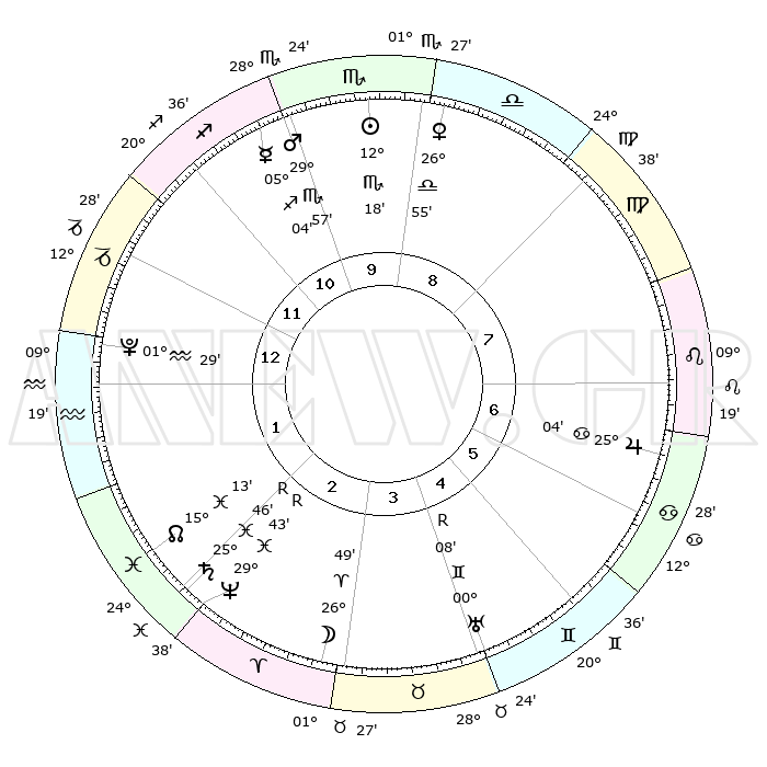 |  | ΘΕΣΕΙΣ ΠΛΑΝΗΤΩΝ ΑΣΤΡΟΛΟΓΙΚΟΥ ΧΑΡΤΗ ΤΗΣ ΣΤΙΓΜΗΣ ΑΥΤΗΣ |  |   |  | Πλανήτης | Ζώδιο | Μοίρες | Δεκαήμ. | Σε οίκο | Απόκλιση |   | Ακμές των οίκων |  | Ηλιος | Σκορπιός | 12°03' | Δεύτερο | 12 | 15 S 27 |   | 1ος | 19°06' | Σκορπιός |  | Σελήνη | Κριός | 23°15' | Τρίτο | 5 | 11 N 50 |   | 2ος | 18°57' | Τοξότης |  | Ερμής | Τοξότης | 04°55' | Πρώτο | 1 | 23 S 55 |   | 3ος | 22°59' | Αιγόκερως |  | Αφροδίτη | Ζυγός | 26°37' | Τρίτο | 11 | 08 S 56 |   | 4ος | 28°32' | Υδροχόος |  | Αρης | Σκορπιός | 29°47' | Τρίτο | 1 | 20 S 31 |   | 5ος | 00°40' | Κριός |  | Δίας | Καρκίνος | 25°04' | Τρίτο | 9 | 21 N 12 |   | 6ος | 27°11' | Κριός |  | Κρόνος | Ιχθείς | 25°47'R | Τρίτο | 4 | 03 S 56 |   | 7ος | 19°06' | Ταύρος |  | Ουρανός | Δίδυμοι | 00°09'R | Πρώτο | 7 | 19 N 58 |   | 8ος | 18°57' | Δίδυμοι |  | Ποσειδώνας | Ιχθείς | 29°44'R | Τρίτο | 4 | 01 S 22 |   | 9ος | 22°59' | Καρκίνος |  | Πλούτωνας | Υδροχόος | 01°28' | Πρώτο | 3 | 23 S 30 |   | 10ος | 28°32' | Λέων |  | Β. Δεσμός | Ιχθείς | 15°14' | Δεύτερο | 4 | 05 S 49 |   | 11ος | 00°40' | Ζυγός |  | Ωροσκόπος | Σκορπιός | 19°06' | Δεύτερο |   |   | 12ος | 27°11' | Ζυγός |  | Μεσουράνημα | Λέων | 28°32' | Τρίτο |   |   |   |