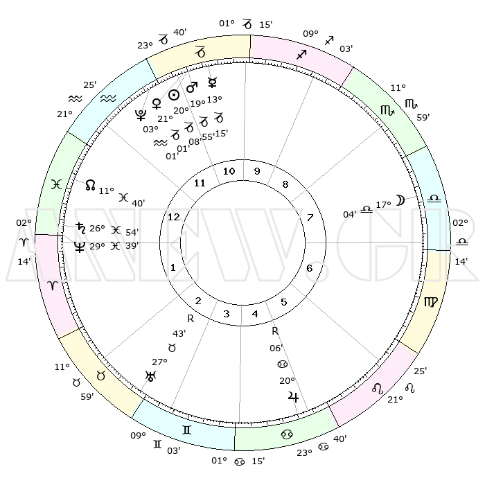 | | ΘΕΣΕΙΣ ΠΛΑΝΗΤΩΝ ΑΣΤΡΟΛΟΓΙΚΟΥ ΧΑΡΤΗ ΤΗΣ ΣΤΙΓΜΗΣ ΑΥΤΗΣ | | | | Πλανήτης | Ζώδιο | Μοίρες | Δεκαήμ. | Σε οίκο | Απόκλιση | | Ακμές των οίκων | | Ηλιος | Αιγόκερως | 19°43' | Δεύτερο | 3 | 21 S 59 | | 1ος | 26°13' | Ζυγός | | Σελήνη | Ζυγός | 12°01' | Δεύτερο | 12 | 07 S 14 | | 2ος | 24°25' | Σκορπιός | | Ερμής | Αιγόκερως | 12°36' | Δεύτερο | 3 | 24 S 16 | | 3ος | 26°05' | Τοξότης | | Αφροδίτη | Αιγόκερως | 20°30' | Τρίτο | 3 | 22 S 41 | | 4ος | 00°02' | Υδροχόος | | Αρης | Αιγόκερως | 19°36' | Δεύτερο | 3 | 22 S 56 | | 5ος | 02°59' | Ιχθείς | | Δίας | Καρκίνος | 20°09'R | Τρίτο | 9 | 22 N 11 | | 6ος | 01°58' | Κριός | | Κρόνος | Ιχθείς | 26°52' | Τρίτο | 5 | 03 S 18 | | 7ος | 26°13' | Κριός | | Ουρανός | Ταύρος | 27°44'R | Τρίτο | 8 | 19 N 27 | | 8ος | 24°25' | Ταύρος | | Ποσειδώνας | Ιχθείς | 29°39' | Τρίτο | 5 | 01 S 22 | | 9ος | 26°05' | Δίδυμοι | | Πλούτωνας | Υδροχόος | 02°60' | Πρώτο | 4 | 23 S 10 | | 10ος | 00°02' | Λέων | | Β. Δεσμός | Ιχθείς | 11°42' | Δεύτερο | 5 | 07 S 11 | | 11ος | 02°59' | Παρθένος | | Ωροσκόπος | Ζυγός | 26°13' | Τρίτο | | | 12ος | 01°58' | Ζυγός | | Μεσουράνημα | Λέων | 00°02' | Πρώτο | | | |