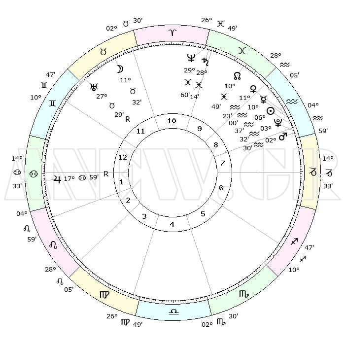 | | ΘΕΣΕΙΣ ΠΛΑΝΗΤΩΝ ΑΣΤΡΟΛΟΓΙΚΟΥ ΧΑΡΤΗ ΤΗΣ ΣΤΙΓΜΗΣ ΑΥΤΗΣ | | | | Πλανήτης | Ζώδιο | Μοίρες | Δεκαήμ. | Σε οίκο | Απόκλιση | | Ακμές των οίκων | | Ηλιος | Υδροχόος | 06°33' | Πρώτο | 9 | 18 S 38 | | 1ος | 21°58' | Δίδυμοι | | Σελήνη | Ταύρος | 10°33' | Δεύτερο | 11 | 19 N 19 | | 2ος | 13°25' | Καρκίνος | | Ερμής | Υδροχόος | 09°53' | Πρώτο | 9 | 19 S 46 | | 3ος | 04°48' | Λέων | | Αφροδίτη | Υδροχόος | 11°18' | Δεύτερο | 9 | 18 S 36 | | 4ος | 29°55' | Λέων | | Αρης | Υδροχόος | 02°27' | Πρώτο | 8 | 20 S 36 | | 5ος | 02°28' | Ζυγός | | Δίας | Καρκίνος | 17°60'R | Δεύτερο | 2 | 22 N 31 | | 6ος | 12°46' | Σκορπιός | | Κρόνος | Ιχθείς | 28°14' | Τρίτο | 10 | 02 S 43 | | 7ος | 21°59' | Τοξότης | | Ουρανός | Ταύρος | 27°29'R | Τρίτο | 12 | 19 N 25 | | 8ος | 13°25' | Αιγόκερως | | Ποσειδώνας | Ιχθείς | 29°60' | Τρίτο | 10 | 01 S 13 | | 9ος | 04°48' | Υδροχόος | | Πλούτωνας | Υδροχόος | 03°32' | Πρώτο | 8 | 23 S 03 | | 10ος | 29°55' | Υδροχόος | | Β. Δεσμός | Ιχθείς | 10°49' | Δεύτερο | 10 | 07 S 30 | | 11ος | 02°28' | Κριός | | Ωροσκόπος | Δίδυμοι | 21°58' | Τρίτο | | | 12ος | 12°46' | Ταύρος | | Μεσουράνημα | Υδροχόος | 29°55' | Τρίτο | | | |