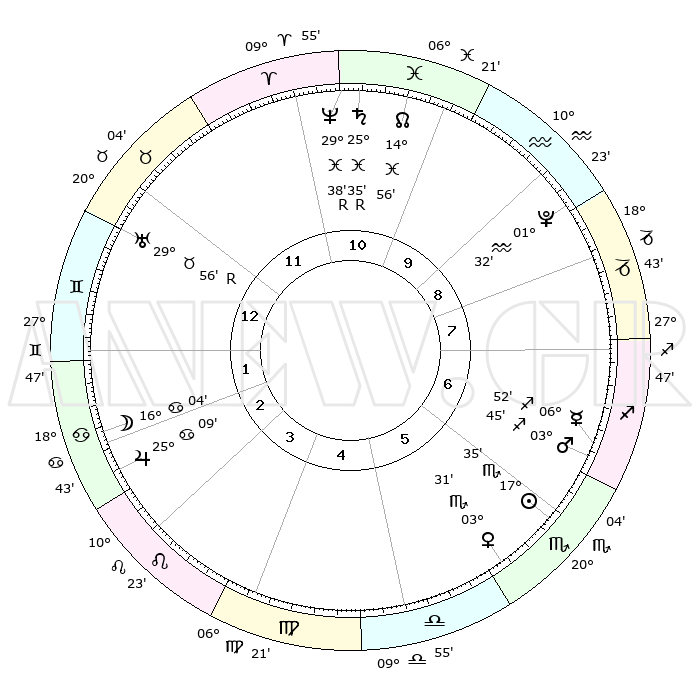 | | ΘΕΣΕΙΣ ΠΛΑΝΗΤΩΝ ΑΣΤΡΟΛΟΓΙΚΟΥ ΧΑΡΤΗ ΤΗΣ ΣΤΙΓΜΗΣ ΑΥΤΗΣ | | | | Πλανήτης | Ζώδιο | Μοίρες | Δεκαήμ. | Σε οίκο | Απόκλιση | | Ακμές των οίκων | | Ηλιος | Σκορπιός | 17°27' | Δεύτερο | 7 | 17 S 02 | | 1ος | 00°04' | Ταύρος | | Σελήνη | Καρκίνος | 14°07' | Δεύτερο | 3 | 27 N 09 | | 2ος | 02°16' | Δίδυμοι | | Ερμής | Τοξότης | 06°52' | Πρώτο | 8 | 23 S 48 | | 3ος | 25°49' | Δίδυμοι | | Αφροδίτη | Σκορπιός | 03°20' | Πρώτο | 7 | 11 S 22 | | 4ος | 17°31' | Καρκίνος | | Αρης | Τοξότης | 03°39' | Πρώτο | 8 | 21 S 20 | | 5ος | 11°55' | Λέων | | Δίας | Καρκίνος | 25°09' | Τρίτο | 4 | 21 N 12 | | 6ος | 14°39' | Παρθένος | | Κρόνος | Ιχθείς | 25°35'R | Τρίτο | 12 | 04 S 00 | | 7ος | 00°04' | Σκορπιός | | Ουρανός | Ταύρος | 29°56'R | Τρίτο | 1 | 19 N 56 | | 8ος | 02°16' | Τοξότης | | Ποσειδώνας | Ιχθείς | 29°38'R | Τρίτο | 12 | 01 S 24 | | 9ος | 25°49' | Τοξότης | | Πλούτωνας | Υδροχόος | 01°32' | Πρώτο | 10 | 23 S 29 | | 10ος | 17°31' | Αιγόκερως | | Β. Δεσμός | Ιχθείς | 14°57' | Δεύτερο | 12 | 05 S 56 | | 11ος | 11°55' | Υδροχόος | | Ωροσκόπος | Ταύρος | 00°04' | Πρώτο | | | 12ος | 14°39' | Ιχθείς | | Μεσουράνημα | Αιγόκερως | 17°31' | Δεύτερο | | | |