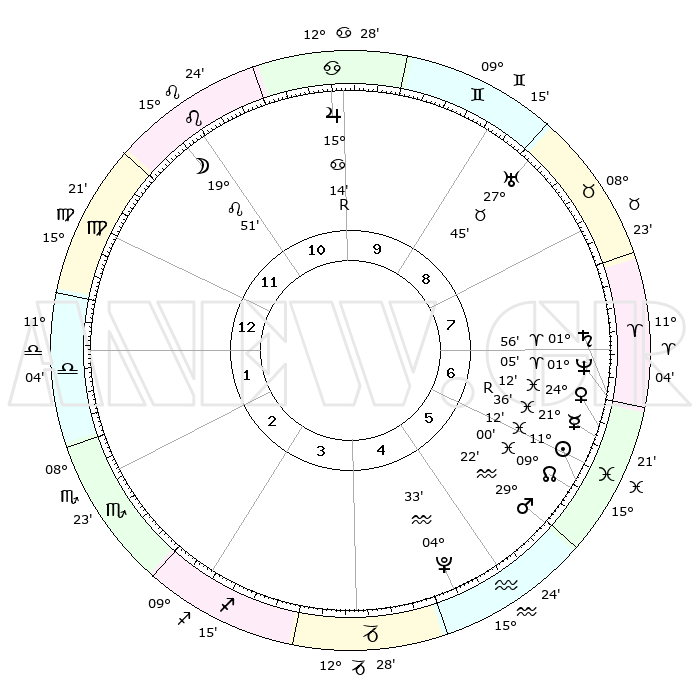| | ΘΕΣΕΙΣ ΠΛΑΝΗΤΩΝ ΑΣΤΡΟΛΟΓΙΚΟΥ ΧΑΡΤΗ ΤΗΣ ΣΤΙΓΜΗΣ ΑΥΤΗΣ | | | | Πλανήτης | Ζώδιο | Μοίρες | Δεκαήμ. | Σε οίκο | Απόκλιση | | Ακμές των οίκων | | Ηλιος | Ιχθείς | 11°07' | Δεύτερο | 6 | 07 S 24 | | 1ος | 20°35' | Παρθένος | | Σελήνη | Λέων | 18°54' | Δεύτερο | 11 | 16 N 53 | | 2ος | 16°26' | Ζυγός | | Ερμής | Ιχθείς | 21°38'R | Τρίτο | 7 | 00 S 11 | | 3ος | 16°28' | Σκορπιός | | Αφροδίτη | Ιχθείς | 24°07' | Τρίτο | 7 | 03 S 35 | | 4ος | 19°24' | Τοξότης | | Αρης | Υδροχόος | 29°19' | Τρίτο | 6 | 12 S 44 | | 5ος | 22°34' | Αιγόκερως | | Δίας | Καρκίνος | 15°14'R | Δεύτερο | 10 | 22 N 54 | | 6ος | 23°22' | Υδροχόος | | Κρόνος | Κριός | 01°55' | Πρώτο | 7 | 01 S 11 | | 7ος | 20°35' | Ιχθείς | | Ουρανός | Ταύρος | 27°45' | Τρίτο | 9 | 19 N 29 | | 8ος | 16°26' | Κριός | | Ποσειδώνας | Κριός | 01°05' | Πρώτο | 7 | 00 S 46 | | 9ος | 16°28' | Ταύρος | | Πλούτωνας | Υδροχόος | 04°33' | Πρώτο | 5 | 22 S 52 | | 10ος | 19°24' | Δίδυμοι | | Β. Δεσμός | Ιχθείς | 09°00' | Πρώτο | 6 | 08 S 11 | | 11ος | 22°34' | Καρκίνος | | Ωροσκόπος | Παρθένος | 20°35' | Τρίτο | | | 12ος | 23°22' | Λέων | | Μεσουράνημα | Δίδυμοι | 19°24' | Δεύτερο | | | |