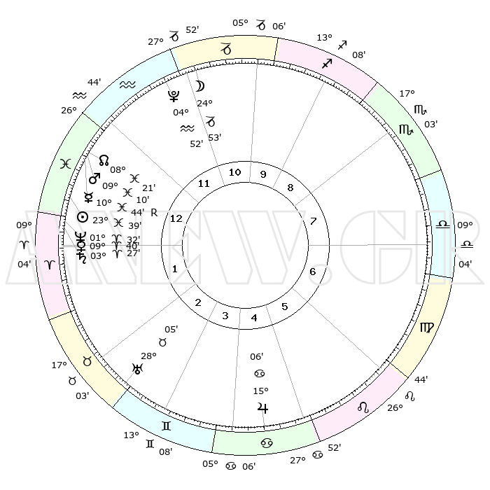 | | ΘΕΣΕΙΣ ΠΛΑΝΗΤΩΝ ΑΣΤΡΟΛΟΓΙΚΟΥ ΧΑΡΤΗ ΤΗΣ ΣΤΙΓΜΗΣ ΑΥΤΗΣ | | | | Πλανήτης | Ζώδιο | Μοίρες | Δεκαήμ. | Σε οίκο | Απόκλιση | | Ακμές των οίκων | | Ηλιος | Ιχθείς | 23°35' | Τρίτο | 1 | 02 S 33 | | 1ος | 04°02' | Ιχθείς | | Σελήνη | Αιγόκερως | 24°08' | Τρίτο | 11 | 24 S 57 | | 2ος | 19°05' | Κριός | | Ερμής | Ιχθείς | 10°47'R | Δεύτερο | 1 | 05 S 07 | | 3ος | 21°00' | Ταύρος | | Αφροδίτη | Κριός | 09°36' | Πρώτο | 1 | 02 N 49 | | 4ος | 15°02' | Δίδυμοι | | Αρης | Ιχθείς | 09°07' | Πρώτο | 1 | 09 S 09 | | 5ος | 06°43' | Καρκίνος | | Δίας | Καρκίνος | 15°06' | Δεύτερο | 5 | 22 N 56 | | 6ος | 00°42' | Λέων | | Κρόνος | Κριός | 03°26' | Πρώτο | 1 | 00 S 35 | | 7ος | 04°02' | Παρθένος | | Ουρανός | Ταύρος | 28°05' | Τρίτο | 3 | 19 N 33 | | 8ος | 19°05' | Ζυγός | | Ποσειδώνας | Κριός | 01°32' | Πρώτο | 1 | 00 S 35 | | 9ος | 21°00' | Σκορπιός | | Πλούτωνας | Υδροχόος | 04°52' | Πρώτο | 12 | 22 S 50 | | 10ος | 15°02' | Τοξότης | | Β. Δεσμός | Ιχθείς | 08°21' | Πρώτο | 1 | 08 S 26 | | 11ος | 06°43' | Αιγόκερως | | Ωροσκόπος | Ιχθείς | 04°02' | Πρώτο | | | 12ος | 00°42' | Υδροχόος | | Μεσουράνημα | Τοξότης | 15°02' | Δεύτερο | | | |