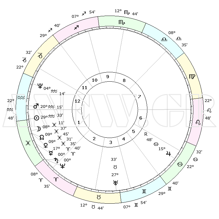 | | ΘΕΣΕΙΣ ΠΛΑΝΗΤΩΝ ΑΣΤΡΟΛΟΓΙΚΟΥ ΧΑΡΤΗ ΤΗΣ ΣΤΙΓΜΗΣ ΑΥΤΗΣ | | | | Πλανήτης | Ζώδιο | Μοίρες | Δεκαήμ. | Σε οίκο | Απόκλιση | | Ακμές των οίκων | | Ηλιος | Υδροχόος | 29°29' | Τρίτο | 1 | 11 S 39 | | 1ος | 22°18' | Αιγόκερως | | Σελήνη | Ιχθείς | 07°17' | Πρώτο | 2 | 08 S 58 | | 2ος | 04°57' | Ιχθείς | | Ερμής | Ιχθείς | 17°26' | Δεύτερο | 2 | 04 S 14 | | 3ος | 14°26' | Κριός | | Αφροδίτη | Ιχθείς | 09°40' | Πρώτο | 2 | 09 S 18 | | 4ος | 14°17' | Ταύρος | | Αρης | Υδροχόος | 20°12' | Τρίτο | 1 | 15 S 47 | | 5ος | 07°42' | Δίδυμοι | | Δίας | Καρκίνος | 15°48'R | Δεύτερο | 6 | 22 N 50 | | 6ος | 28°56' | Δίδυμοι | | Κρόνος | Κριός | 00°35' | Πρώτο | 2 | 01 S 44 | | 7ος | 22°18' | Καρκίνος | | Ουρανός | Ταύρος | 27°33' | Τρίτο | 4 | 19 N 26 | | 8ος | 04°57' | Παρθένος | | Ποσειδώνας | Κριός | 00°40' | Πρώτο | 2 | 00 S 56 | | 9ος | 14°26' | Ζυγός | | Πλούτωνας | Υδροχόος | 04°14' | Πρώτο | 1 | 22 S 56 | | 10ος | 14°17' | Σκορπιός | | Β. Δεσμός | Ιχθείς | 09°37' | Πρώτο | 2 | 07 S 58 | | 11ος | 07°42' | Τοξότης | | Ωροσκόπος | Αιγόκερως | 22°18' | Τρίτο | | | 12ος | 28°56' | Τοξότης | | Μεσουράνημα | Σκορπιός | 14°17' | Δεύτερο | | | |