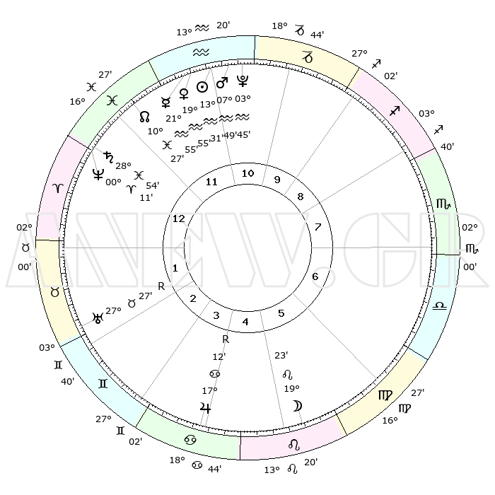 | | ΘΕΣΕΙΣ ΠΛΑΝΗΤΩΝ ΑΣΤΡΟΛΟΓΙΚΟΥ ΧΑΡΤΗ ΤΗΣ ΣΤΙΓΜΗΣ ΑΥΤΗΣ | | | | Πλανήτης | Ζώδιο | Μοίρες | Δεκαήμ. | Σε οίκο | Απόκλιση | | Ακμές των οίκων | | Ηλιος | Υδροχόος | 13°28' | Δεύτερο | 11 | 16 S 47 | | 1ος | 27°05' | Ιχθείς | | Σελήνη | Λέων | 18°31' | Δεύτερο | 6 | 17 N 01 | | 2ος | 08°04' | Ταύρος | | Ερμής | Υδροχόος | 21°48' | Τρίτο | 12 | 15 S 56 | | 3ος | 05°56' | Δίδυμοι | | Αφροδίτη | Υδροχόος | 19°50' | Δεύτερο | 12 | 16 S 10 | | 4ος | 28°22' | Δίδυμοι | | Αρης | Υδροχόος | 07°46' | Πρώτο | 11 | 19 S 20 | | 5ος | 20°33' | Καρκίνος | | Δίας | Καρκίνος | 17°13'R | Δεύτερο | 4 | 22 N 38 | | 6ος | 17°31' | Λέων | | Κρόνος | Ιχθείς | 28°53' | Τρίτο | 1 | 02 S 26 | | 7ος | 27°05' | Παρθένος | | Ουρανός | Ταύρος | 27°27'R | Τρίτο | 2 | 19 N 24 | | 8ος | 08°04' | Σκορπιός | | Ποσειδώνας | Κριός | 00°11' | Πρώτο | 1 | 01 S 08 | | 9ος | 05°56' | Τοξότης | | Πλούτωνας | Υδροχόος | 03°45' | Πρώτο | 11 | 23 S 01 | | 10ος | 28°22' | Τοξότης | | Β. Δεσμός | Ιχθείς | 10°27' | Δεύτερο | 12 | 07 S 39 | | 11ος | 20°33' | Αιγόκερως | | Ωροσκόπος | Ιχθείς | 27°05' | Τρίτο | | | 12ος | 17°31' | Υδροχόος | | Μεσουράνημα | Τοξότης | 28°22' | Τρίτο | | | |
