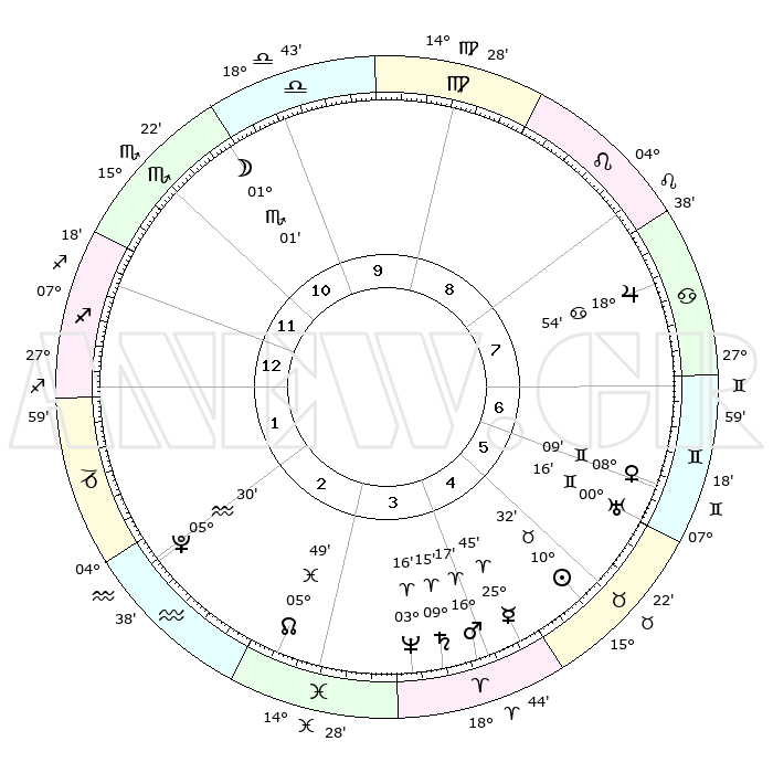 | | ΘΕΣΕΙΣ ΠΛΑΝΗΤΩΝ ΑΣΤΡΟΛΟΓΙΚΟΥ ΧΑΡΤΗ ΤΗΣ ΣΤΙΓΜΗΣ ΑΥΤΗΣ | | | | Πλανήτης | Ζώδιο | Μοίρες | Δεκαήμ. | Σε οίκο | Απόκλιση | | Ακμές των οίκων | | Ηλιος | Ταύρος | 10°29' | Δεύτερο | 5 | 14 N 58 | | 1ος | 14°14' | Τοξότης | | Σελήνη | Σκορπιός | 00°29' | Πρώτο | 10 | 15 S 26 | | 2ος | 17°46' | Αιγόκερως | | Ερμής | Κριός | 25°40' | Τρίτο | 4 | 08 N 07 | | 3ος | 25°51' | Υδροχόος | | Αφροδίτη | Δίδυμοι | 08°06' | Πρώτο | 6 | 22 N 32 | | 4ος | 01°37' | Κριός | | Αρης | Κριός | 16°15' | Δεύτερο | 4 | 05 N 34 | | 5ος | 00°33' | Ταύρος | | Δίας | Καρκίνος | 18°54' | Δεύτερο | 8 | 22 N 29 | | 6ος | 23°47' | Ταύρος | | Κρόνος | Κριός | 09°15' | Πρώτο | 4 | 01 N 40 | | 7ος | 14°14' | Δίδυμοι | | Ουρανός | Δίδυμοι | 00°16' | Πρώτο | 6 | 20 N 02 | | 8ος | 17°46' | Καρκίνος | | Ποσειδώνας | Κριός | 03°15' | Πρώτο | 4 | 00 N 05 | | 9ος | 25°51' | Λέων | | Πλούτωνας | Υδροχόος | 05°30' | Πρώτο | 2 | 22 S 49 | | 10ος | 01°37' | Ζυγός | | Β. Δεσμός | Ιχθείς | 05°49' | Πρώτο | 3 | 09 S 22 | | 11ος | 00°33' | Σκορπιός | | Ωροσκόπος | Τοξότης | 14°14' | Δεύτερο | | | 12ος | 23°47' | Σκορπιός | | Μεσουράνημα | Ζυγός | 01°37' | Πρώτο | | | |