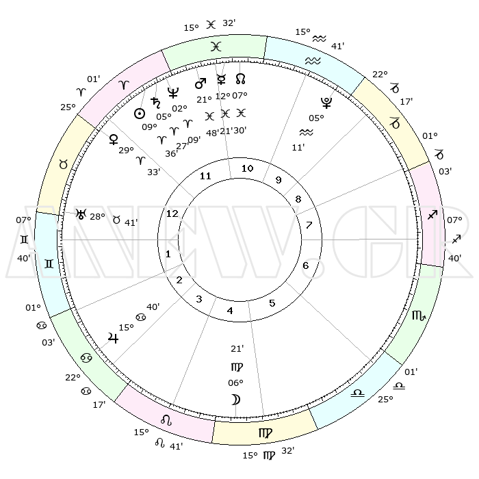 | | ΘΕΣΕΙΣ ΠΛΑΝΗΤΩΝ ΑΣΤΡΟΛΟΓΙΚΟΥ ΧΑΡΤΗ ΤΗΣ ΣΤΙΓΜΗΣ ΑΥΤΗΣ | | | | Πλανήτης | Ζώδιο | Μοίρες | Δεκαήμ. | Σε οίκο | Απόκλιση | | Ακμές των οίκων | | Ηλιος | Κριός | 09°31' | Πρώτο | 12 | 03 N 46 | | 1ος | 00°35' | Ταύρος | | Σελήνη | Παρθένος | 05°18' | Πρώτο | 5 | 09 N 51 | | 2ος | 02°39' | Δίδυμοι | | Ερμής | Ιχθείς | 12°17' | Δεύτερο | 11 | 07 S 53 | | 3ος | 26°09' | Δίδυμοι | | Αφροδίτη | Κριός | 29°27' | Τρίτο | 12 | 10 N 48 | | 4ος | 17°50' | Καρκίνος | | Αρης | Ιχθείς | 21°44' | Τρίτο | 12 | 04 S 15 | | 5ος | 12°18' | Λέων | | Δίας | Καρκίνος | 15°40' | Δεύτερο | 3 | 22 N 53 | | 6ος | 15°07' | Παρθένος | | Κρόνος | Κριός | 05°26' | Πρώτο | 12 | 00 N 12 | | 7ος | 00°35' | Σκορπιός | | Ουρανός | Ταύρος | 28°41' | Τρίτο | 1 | 19 N 42 | | 8ος | 02°39' | Τοξότης | | Ποσειδώνας | Κριός | 02°09' | Πρώτο | 12 | 00 S 21 | | 9ος | 26°09' | Τοξότης | | Πλούτωνας | Υδροχόος | 05°11' | Πρώτο | 10 | 22 S 48 | | 10ος | 17°50' | Αιγόκερως | | Β. Δεσμός | Ιχθείς | 07°30' | Πρώτο | 11 | 08 S 45 | | 11ος | 12°18' | Υδροχόος | | Ωροσκόπος | Ταύρος | 00°35' | Πρώτο | | | 12ος | 15°07' | Ιχθείς | | Μεσουράνημα | Αιγόκερως | 17°50' | Δεύτερο | | | |