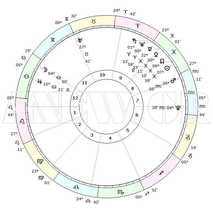 | | ΘΕΣΕΙΣ ΠΛΑΝΗΤΩΝ ΑΣΤΡΟΛΟΓΙΚΟΥ ΧΑΡΤΗ ΤΗΣ ΣΤΙΓΜΗΣ ΑΥΤΗΣ | | | | Πλανήτης | Ζώδιο | Μοίρες | Δεκαήμ. | Σε οίκο | Απόκλιση | | Ακμές των οίκων | | Ηλιος | Ιχθείς | 07°54' | Πρώτο | 9 | 08 S 36 | | 1ος | 16°39' | Καρκίνος | | Σελήνη | Καρκίνος | 04°00' | Πρώτο | 12 | 28 N 09 | | 2ος | 07°06' | Λέων | | Ερμής | Ιχθείς | 22°34'R | Τρίτο | 9 | 00 S 21 | | 3ος | 00°27' | Παρθένος | | Αφροδίτη | Ιχθείς | 20°06' | Τρίτο | 9 | 05 S 12 | | 4ος | 29°31' | Παρθένος | | Αρης | Υδροχόος | 26°47' | Τρίτο | 8 | 13 S 37 | | 5ος | 05°21' | Σκορπιός | | Δίας | Καρκίνος | 15°21'R | Δεύτερο | 12 | 22 N 53 | | 6ος | 13°17' | Τοξότης | | Κρόνος | Κριός | 01°33' | Πρώτο | 10 | 01 S 21 | | 7ος | 16°39' | Αιγόκερως | | Ουρανός | Ταύρος | 27°41' | Τρίτο | 11 | 19 N 28 | | 8ος | 07°06' | Υδροχόος | | Ποσειδώνας | Κριός | 00°58' | Πρώτο | 10 | 00 S 49 | | 9ος | 00°27' | Ιχθείς | | Πλούτωνας | Υδροχόος | 04°28' | Πρώτο | 7 | 22 S 53 | | 10ος | 29°31' | Ιχθείς | | Β. Δεσμός | Ιχθείς | 09°11' | Πρώτο | 9 | 08 S 08 | | 11ος | 05°21' | Ταύρος | | Ωροσκόπος | Καρκίνος | 16°39' | Δεύτερο | | | 12ος | 13°17' | Δίδυμοι | | Μεσουράνημα | Ιχθείς | 29°31' | Τρίτο | | | |