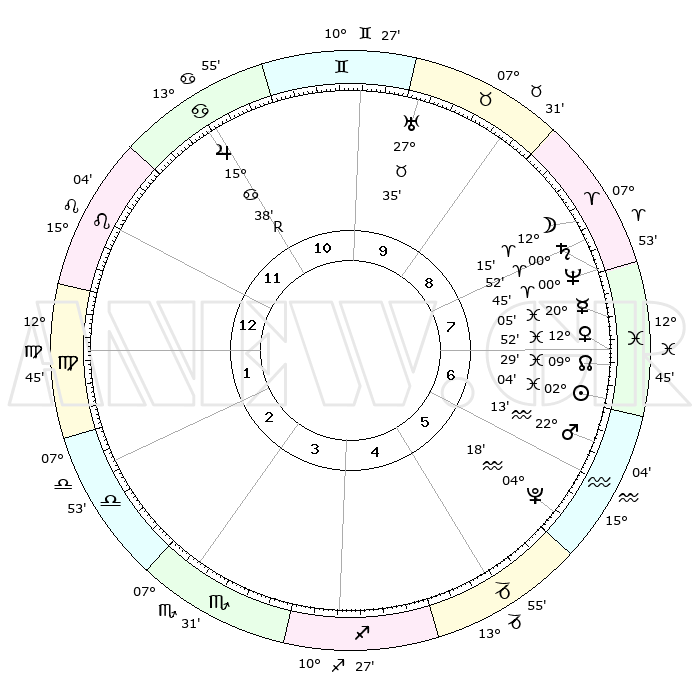 | | ΘΕΣΕΙΣ ΠΛΑΝΗΤΩΝ ΑΣΤΡΟΛΟΓΙΚΟΥ ΧΑΡΤΗ ΤΗΣ ΣΤΙΓΜΗΣ ΑΥΤΗΣ | | | | Πλανήτης | Ζώδιο | Μοίρες | Δεκαήμ. | Σε οίκο | Απόκλιση | | Ακμές των οίκων | | Ηλιος | Ιχθείς | 02°00' | Πρώτο | 7 | 10 S 45 | | 1ος | 25°31' | Λέων | | Σελήνη | Κριός | 11°26' | Δεύτερο | 8 | 07 N 08 | | 2ος | 18°54' | Παρθένος | | Ερμής | Ιχθείς | 20°02' | Τρίτο | 8 | 02 S 39 | | 3ος | 17°09' | Ζυγός | | Αφροδίτη | Ιχθείς | 12°48' | Δεύτερο | 7 | 08 S 05 | | 4ος | 19°59' | Σκορπιός | | Αρης | Υδροχόος | 22°10' | Τρίτο | 6 | 15 S 09 | | 5ος | 24°30' | Τοξότης | | Δίας | Καρκίνος | 15°38'R | Δεύτερο | 11 | 22 N 51 | | 6ος | 26°50' | Αιγόκερως | | Κρόνος | Κριός | 00°52' | Πρώτο | 8 | 01 S 37 | | 7ος | 25°31' | Υδροχόος | | Ουρανός | Ταύρος | 27°35' | Τρίτο | 10 | 19 N 26 | | 8ος | 18°54' | Ιχθείς | | Ποσειδώνας | Κριός | 00°45' | Πρώτο | 8 | 00 S 54 | | 9ος | 17°09' | Κριός | | Πλούτωνας | Υδροχόος | 04°18' | Πρώτο | 6 | 22 S 55 | | 10ος | 19°59' | Ταύρος | | Β. Δεσμός | Ιχθείς | 09°29' | Πρώτο | 7 | 08 S 01 | | 11ος | 24°30' | Δίδυμοι | | Ωροσκόπος | Λέων | 25°31' | Τρίτο | | | 12ος | 26°50' | Καρκίνος | | Μεσουράνημα | Ταύρος | 19°59' | Δεύτερο | | | |