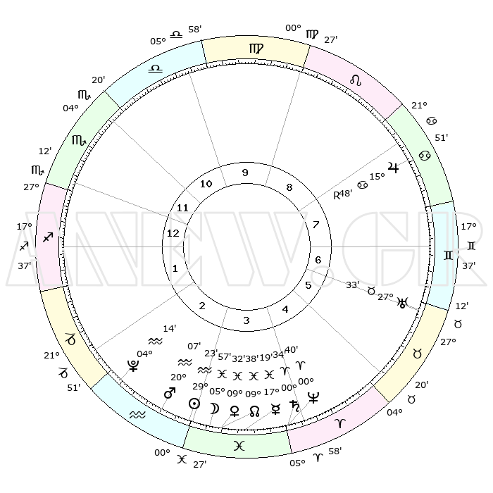 | | ΘΕΣΕΙΣ ΠΛΑΝΗΤΩΝ ΑΣΤΡΟΛΟΓΙΚΟΥ ΧΑΡΤΗ ΤΗΣ ΣΤΙΓΜΗΣ ΑΥΤΗΣ | | | | Πλανήτης | Ζώδιο | Μοίρες | Δεκαήμ. | Σε οίκο | Απόκλιση | | Ακμές των οίκων | | Ηλιος | Υδροχόος | 29°18' | Τρίτο | 3 | 11 S 43 | | 1ος | 23°41' | Σκορπιός | | Σελήνη | Ιχθείς | 04°53' | Πρώτο | 4 | 10 S 04 | | 2ος | 24°01' | Τοξότης | | Ερμής | Ιχθείς | 17°13' | Δεύτερο | 4 | 04 S 22 | | 3ος | 28°43' | Αιγόκερως | | Αφροδίτη | Ιχθείς | 09°26' | Πρώτο | 4 | 09 S 23 | | 4ος | 04°32' | Ιχθείς | | Αρης | Υδροχόος | 20°03' | Τρίτο | 3 | 15 S 49 | | 5ος | 06°16' | Κριός | | Δίας | Καρκίνος | 15°49'R | Δεύτερο | 8 | 22 N 50 | | 6ος | 02°10' | Ταύρος | | Κρόνος | Κριός | 00°33' | Πρώτο | 4 | 01 S 45 | | 7ος | 23°41' | Ταύρος | | Ουρανός | Ταύρος | 27°33' | Τρίτο | 7 | 19 N 26 | | 8ος | 24°01' | Δίδυμοι | | Ποσειδώνας | Κριός | 00°40' | Πρώτο | 4 | 00 S 56 | | 9ος | 28°43' | Καρκίνος | | Πλούτωνας | Υδροχόος | 04°13' | Πρώτο | 3 | 22 S 56 | | 10ος | 04°32' | Παρθένος | | Β. Δεσμός | Ιχθείς | 09°38' | Πρώτο | 4 | 07 S 57 | | 11ος | 06°16' | Ζυγός | | Ωροσκόπος | Σκορπιός | 23°41' | Τρίτο | | | 12ος | 02°10' | Σκορπιός | | Μεσουράνημα | Παρθένος | 04°32' | Πρώτο | | | |