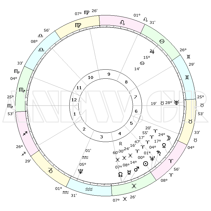 | | ΘΕΣΕΙΣ ΠΛΑΝΗΤΩΝ ΑΣΤΡΟΛΟΓΙΚΟΥ ΧΑΡΤΗ ΤΗΣ ΣΤΙΓΜΗΣ ΑΥΤΗΣ | | | | Πλανήτης | Ζώδιο | Μοίρες | Δεκαήμ. | Σε οίκο | Απόκλιση | | Ακμές των οίκων | | Ηλιος | Κριός | 00°12' | Πρώτο | 5 | 00 N 05 | | 1ος | 04°09' | Σκορπιός | | Σελήνη | Κριός | 23°15' | Τρίτο | 6 | 12 N 26 | | 2ος | 02°49' | Τοξότης | | Ερμής | Ιχθείς | 08°30'R | Πρώτο | 4 | 07 S 28 | | 3ος | 05°08' | Αιγόκερως | | Αφροδίτη | Κριός | 17°50' | Δεύτερο | 6 | 06 N 12 | | 4ος | 09°36' | Υδροχόος | | Αρης | Ιχθείς | 14°21' | Δεύτερο | 5 | 07 S 09 | | 5ος | 12°27' | Ιχθείς | | Δίας | Καρκίνος | 15°14' | Δεύτερο | 9 | 22 N 55 | | 6ος | 10°44' | Κριός | | Κρόνος | Κριός | 04°16' | Πρώτο | 5 | 00 S 15 | | 7ος | 04°09' | Ταύρος | | Ουρανός | Ταύρος | 28°19' | Τρίτο | 7 | 19 N 37 | | 8ος | 02°49' | Δίδυμοι | | Ποσειδώνας | Κριός | 01°47' | Πρώτο | 5 | 00 S 29 | | 9ος | 05°08' | Καρκίνος | | Πλούτωνας | Υδροχόος | 05°01' | Πρώτο | 3 | 22 S 49 | | 10ος | 09°36' | Λέων | | Β. Δεσμός | Ιχθείς | 07°60' | Πρώτο | 4 | 08 S 34 | | 11ος | 12°27' | Παρθένος | | Ωροσκόπος | Σκορπιός | 04°09' | Πρώτο | | | 12ος | 10°44' | Ζυγός | | Μεσουράνημα | Λέων | 09°36' | Πρώτο | | | |