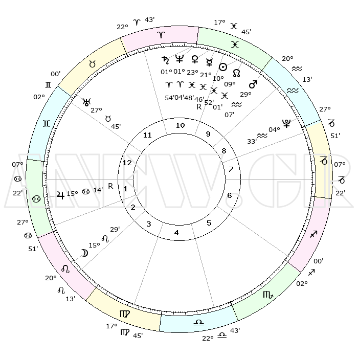 | | ΘΕΣΕΙΣ ΠΛΑΝΗΤΩΝ ΑΣΤΡΟΛΟΓΙΚΟΥ ΧΑΡΤΗ ΤΗΣ ΣΤΙΓΜΗΣ ΑΥΤΗΣ | | | | Πλανήτης | Ζώδιο | Μοίρες | Δεκαήμ. | Σε οίκο | Απόκλιση | | Ακμές των οίκων | | Ηλιος | Ιχθείς | 10°49' | Δεύτερο | 10 | 07 S 31 | | 1ος | 15°38' | Δίδυμοι | | Σελήνη | Λέων | 14°36' | Δεύτερο | 3 | 18 N 32 | | 2ος | 07°49' | Καρκίνος | | Ερμής | Ιχθείς | 21°48'R | Τρίτο | 10 | 00 S 10 | | 3ος | 29°03' | Καρκίνος | | Αφροδίτη | Ιχθείς | 23°43' | Τρίτο | 10 | 03 S 44 | | 4ος | 23°20' | Λέων | | Αρης | Υδροχόος | 29°04' | Τρίτο | 10 | 12 S 49 | | 5ος | 24°41' | Παρθένος | | Δίας | Καρκίνος | 15°14'R | Δεύτερο | 2 | 22 N 54 | | 6ος | 04°50' | Σκορπιός | | Κρόνος | Κριός | 01°53' | Πρώτο | 11 | 01 S 12 | | 7ος | 15°38' | Τοξότης | | Ουρανός | Ταύρος | 27°44' | Τρίτο | 12 | 19 N 29 | | 8ος | 07°49' | Αιγόκερως | | Ποσειδώνας | Κριός | 01°04' | Πρώτο | 11 | 00 S 47 | | 9ος | 29°03' | Αιγόκερως | | Πλούτωνας | Υδροχόος | 04°33' | Πρώτο | 9 | 22 S 52 | | 10ος | 23°20' | Υδροχόος | | Β. Δεσμός | Ιχθείς | 09°01' | Πρώτο | 10 | 08 S 11 | | 11ος | 24°41' | Ιχθείς | | Ωροσκόπος | Δίδυμοι | 15°38' | Δεύτερο | | | 12ος | 04°50' | Ταύρος | | Μεσουράνημα | Υδροχόος | 23°20' | Τρίτο | | | |