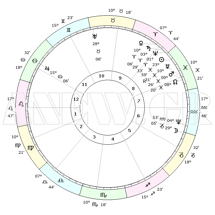 | | ΘΕΣΕΙΣ ΠΛΑΝΗΤΩΝ ΑΣΤΡΟΛΟΓΙΚΟΥ ΧΑΡΤΗ ΤΗΣ ΣΤΙΓΜΗΣ ΑΥΤΗΣ | | | | Πλανήτης | Ζώδιο | Μοίρες | Δεκαήμ. | Σε οίκο | Απόκλιση | | Ακμές των οίκων | | Ηλιος | Ιχθείς | 23°55' | Τρίτο | 9 | 02 S 25 | | 1ος | 28°37' | Καρκίνος | | Σελήνη | Αιγόκερως | 28°15' | Τρίτο | 6 | 23 S 52 | | 2ος | 19°34' | Λέων | | Ερμής | Ιχθείς | 10°33'R | Δεύτερο | 8 | 05 S 16 | | 3ος | 14°26' | Παρθένος | | Αφροδίτη | Κριός | 10°01' | Δεύτερο | 9 | 02 N 59 | | 4ος | 15°17' | Ζυγός | | Αρης | Ιχθείς | 09°23' | Πρώτο | 8 | 09 S 03 | | 5ος | 21°21' | Σκορπιός | | Δίας | Καρκίνος | 15°06' | Δεύτερο | 12 | 22 N 56 | | 6ος | 27°18' | Τοξότης | | Κρόνος | Κριός | 03°29' | Πρώτο | 9 | 00 S 34 | | 7ος | 28°37' | Αιγόκερως | | Ουρανός | Ταύρος | 28°06' | Τρίτο | 11 | 19 N 34 | | 8ος | 19°34' | Υδροχόος | | Ποσειδώνας | Κριός | 01°33' | Πρώτο | 9 | 00 S 35 | | 9ος | 14°26' | Ιχθείς | | Πλούτωνας | Υδροχόος | 04°52' | Πρώτο | 7 | 22 S 50 | | 10ος | 15°17' | Κριός | | Β. Δεσμός | Ιχθείς | 08°20' | Πρώτο | 8 | 08 S 27 | | 11ος | 21°21' | Ταύρος | | Ωροσκόπος | Καρκίνος | 28°37' | Τρίτο | | | 12ος | 27°18' | Δίδυμοι | | Μεσουράνημα | Κριός | 15°17' | Δεύτερο | | | |