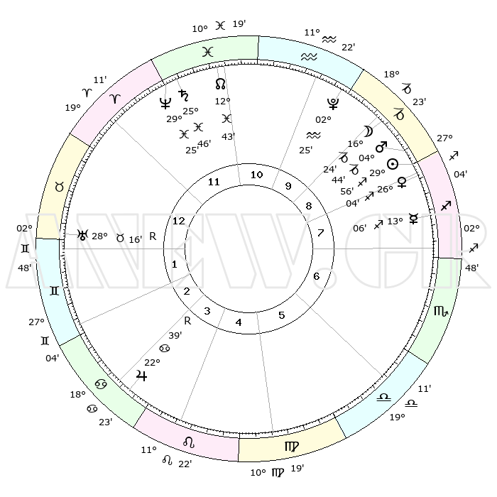 | | ΘΕΣΕΙΣ ΠΛΑΝΗΤΩΝ ΑΣΤΡΟΛΟΓΙΚΟΥ ΧΑΡΤΗ ΤΗΣ ΣΤΙΓΜΗΣ ΑΥΤΗΣ | | | | Πλανήτης | Ζώδιο | Μοίρες | Δεκαήμ. | Σε οίκο | Απόκλιση | | Ακμές των οίκων | | Ηλιος | Τοξότης | 29°52' | Τρίτο | 9 | 23 S 26 | | 1ος | 00°30' | Ταύρος | | Σελήνη | Αιγόκερως | 15°34' | Δεύτερο | 9 | 26 S 40 | | 2ος | 02°35' | Δίδυμοι | | Ερμής | Τοξότης | 12°60' | Δεύτερο | 8 | 21 S 39 | | 3ος | 26°05' | Δίδυμοι | | Αφροδίτη | Τοξότης | 25°59' | Τρίτο | 8 | 23 S 28 | | 4ος | 17°47' | Καρκίνος | | Αρης | Αιγόκερως | 04°41' | Πρώτο | 9 | 24 S 10 | | 5ος | 12°13' | Λέων | | Δίας | Καρκίνος | 22°39'R | Τρίτο | 4 | 21 N 44 | | 6ος | 15°02' | Παρθένος | | Κρόνος | Ιχθείς | 25°46' | Τρίτο | 12 | 03 S 47 | | 7ος | 00°30' | Σκορπιός | | Ουρανός | Ταύρος | 28°16'R | Τρίτο | 1 | 19 N 34 | | 8ος | 02°35' | Τοξότης | | Ποσειδώνας | Ιχθείς | 29°24' | Τρίτο | 12 | 01 S 28 | | 9ος | 26°05' | Τοξότης | | Πλούτωνας | Υδροχόος | 02°25' | Πρώτο | 10 | 23 S 17 | | 10ος | 17°46' | Αιγόκερως | | Β. Δεσμός | Ιχθείς | 12°44' | Δεύτερο | 11 | 06 S 47 | | 11ος | 12°13' | Υδροχόος | | Ωροσκόπος | Ταύρος | 00°30' | Πρώτο | | | 12ος | 15°02' | Ιχθείς | | Μεσουράνημα | Αιγόκερως | 17°46' | Δεύτερο | | | |