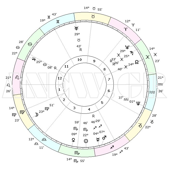 | | ΘΕΣΕΙΣ ΠΛΑΝΗΤΩΝ ΑΣΤΡΟΛΟΓΙΚΟΥ ΧΑΡΤΗ ΤΗΣ ΣΤΙΓΜΗΣ ΑΥΤΗΣ | | | | Πλανήτης | Ζώδιο | Μοίρες | Δεκαήμ. | Σε οίκο | Απόκλιση | | Ακμές των οίκων | | Ηλιος | Σκορπιός | 22°43' | Τρίτο | 4 | 18 S 27 | | 1ος | 07°09' | Λέων | | Σελήνη | Παρθένος | 23°15' | Τρίτο | 2 | 02 N 06 | | 2ος | 28°44' | Λέων | | Ερμής | Τοξότης | 04°48'R | Πρώτο | 5 | 22 S 20 | | 3ος | 24°45' | Παρθένος | | Αφροδίτη | Σκορπιός | 09°55' | Πρώτο | 4 | 13 S 38 | | 4ος | 26°34' | Ζυγός | | Αρης | Τοξότης | 07°27' | Πρώτο | 5 | 22 S 04 | | 5ος | 02°20' | Τοξότης | | Δίας | Καρκίνος | 25°08'R | Τρίτο | 12 | 21 N 13 | | 6ος | 06°55' | Αιγόκερως | | Κρόνος | Ιχθείς | 25°26'R | Τρίτο | 9 | 04 S 02 | | 7ος | 07°09' | Υδροχόος | | Ουρανός | Ταύρος | 29°43'R | Τρίτο | 10 | 19 N 53 | | 8ος | 28°44' | Υδροχόος | | Ποσειδώνας | Ιχθείς | 29°33'R | Τρίτο | 9 | 01 S 26 | | 9ος | 24°45' | Ιχθείς | | Πλούτωνας | Υδροχόος | 01°36' | Πρώτο | 6 | 23 S 28 | | 10ος | 26°34' | Κριός | | Β. Δεσμός | Ιχθείς | 14°40' | Δεύτερο | 8 | 06 S 02 | | 11ος | 02°20' | Δίδυμοι | | Ωροσκόπος | Λέων | 07°09' | Πρώτο | | | 12ος | 06°55' | Καρκίνος | | Μεσουράνημα | Κριός | 26°34' | Τρίτο | | | |