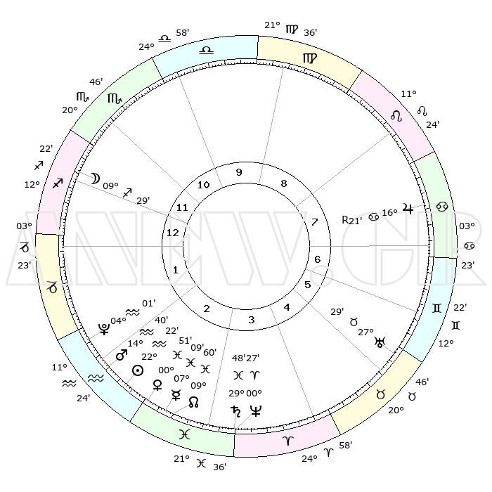 | | ΘΕΣΕΙΣ ΠΛΑΝΗΤΩΝ ΑΣΤΡΟΛΟΓΙΚΟΥ ΧΑΡΤΗ ΤΗΣ ΣΤΙΓΜΗΣ ΑΥΤΗΣ | | | | Πλανήτης | Ζώδιο | Μοίρες | Δεκαήμ. | Σε οίκο | Απόκλιση | | Ακμές των οίκων | | Ηλιος | Υδροχόος | 22°19' | Τρίτο | 2 | 14 S 04 | | 1ος | 14°31' | Τοξότης | | Σελήνη | Τοξότης | 08°47' | Πρώτο | 12 | 26 S 57 | | 2ος | 18°07' | Αιγόκερως | | Ερμής | Ιχθείς | 07°03' | Πρώτο | 3 | 09 S 36 | | 3ος | 26°15' | Υδροχόος | | Αφροδίτη | Ιχθείς | 00°47' | Πρώτο | 3 | 12 S 33 | | 4ος | 01°60' | Κριός | | Αρης | Υδροχόος | 14°37' | Δεύτερο | 2 | 17 S 28 | | 5ος | 00°53' | Ταύρος | | Δίας | Καρκίνος | 16°21'R | Δεύτερο | 7 | 22 N 45 | | 6ος | 24°05' | Ταύρος | | Κρόνος | Ιχθείς | 29°48' | Τρίτο | 3 | 02 S 04 | | 7ος | 14°31' | Δίδυμοι | | Ουρανός | Ταύρος | 27°29' | Τρίτο | 6 | 19 N 25 | | 8ος | 18°07' | Καρκίνος | | Ποσειδώνας | Κριός | 00°26' | Πρώτο | 3 | 01 S 02 | | 9ος | 26°15' | Λέων | | Πλούτωνας | Υδροχόος | 04°01' | Πρώτο | 2 | 22 S 58 | | 10ος | 01°60' | Ζυγός | | Β. Δεσμός | Ιχθείς | 09°60' | Πρώτο | 3 | 07 S 49 | | 11ος | 00°53' | Σκορπιός | | Ωροσκόπος | Τοξότης | 14°31' | Δεύτερο | | | 12ος | 24°05' | Σκορπιός | | Μεσουράνημα | Ζυγός | 01°60' | Πρώτο | | | |