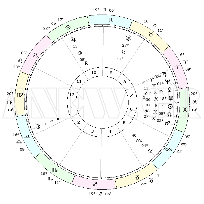 | | ΘΕΣΕΙΣ ΠΛΑΝΗΤΩΝ ΑΣΤΡΟΛΟΓΙΚΟΥ ΧΑΡΤΗ ΤΗΣ ΣΤΙΓΜΗΣ ΑΥΤΗΣ | | | | Πλανήτης | Ζώδιο | Μοίρες | Δεκαήμ. | Σε οίκο | Απόκλιση | | Ακμές των οίκων | | Ηλιος | Ιχθείς | 15°04' | Δεύτερο | 7 | 05 S 53 | | 1ος | 04°51' | Παρθένος | | Σελήνη | Ζυγός | 10°58' | Δεύτερο | 2 | 06 S 55 | | 2ος | 29°12' | Παρθένος | | Ερμής | Ιχθείς | 18°39'R | Δεύτερο | 7 | 01 S 06 | | 3ος | 28°17' | Ζυγός | | Αφροδίτη | Ιχθείς | 29°01' | Τρίτο | 7 | 01 S 34 | | 4ος | 01°14' | Τοξότης | | Αρης | Ιχθείς | 02°25' | Πρώτο | 6 | 11 S 38 | | 5ος | 05°07' | Αιγόκερως | | Δίας | Καρκίνος | 15°08'R | Δεύτερο | 11 | 22 N 55 | | 6ος | 06°43' | Υδροχόος | | Κρόνος | Κριός | 02°24' | Πρώτο | 8 | 01 S 00 | | 7ος | 04°51' | Ιχθείς | | Ουρανός | Ταύρος | 27°51' | Τρίτο | 9 | 19 N 30 | | 8ος | 29°12' | Ιχθείς | | Ποσειδώνας | Κριός | 01°13' | Πρώτο | 8 | 00 S 43 | | 9ος | 28°17' | Κριός | | Πλούτωνας | Υδροχόος | 04°40' | Πρώτο | 5 | 22 S 51 | | 10ος | 01°14' | Δίδυμοι | | Β. Δεσμός | Ιχθείς | 08°48' | Πρώτο | 7 | 08 S 16 | | 11ος | 05°07' | Καρκίνος | | Ωροσκόπος | Παρθένος | 04°51' | Πρώτο | | | 12ος | 06°43' | Λέων | | Μεσουράνημα | Δίδυμοι | 01°14' | Πρώτο | | | |