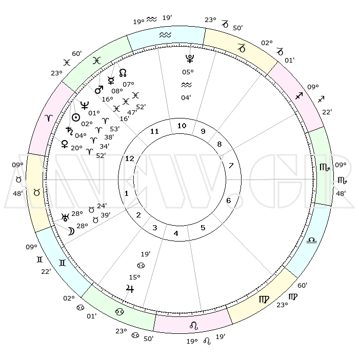 | | ΘΕΣΕΙΣ ΠΛΑΝΗΤΩΝ ΑΣΤΡΟΛΟΓΙΚΟΥ ΧΑΡΤΗ ΤΗΣ ΣΤΙΓΜΗΣ ΑΥΤΗΣ | | | | Πλανήτης | Ζώδιο | Μοίρες | Δεκαήμ. | Σε οίκο | Απόκλιση | | Ακμές των οίκων | | Ηλιος | Κριός | 02°33' | Πρώτο | 1 | 01 N 01 | | 1ος | 00°38' | Κριός | | Σελήνη | Ταύρος | 27°38' | Τρίτο | 2 | 24 N 37 | | 2ος | 10°47' | Ταύρος | | Ερμής | Ιχθείς | 08°46' | Πρώτο | 12 | 07 S 53 | | 3ος | 08°05' | Δίδυμοι | | Αφροδίτη | Κριός | 20°46' | Τρίτο | 1 | 07 N 23 | | 4ος | 00°21' | Καρκίνος | | Αρης | Ιχθείς | 16°13' | Δεύτερο | 12 | 06 S 25 | | 5ος | 22°41' | Καρκίνος | | Δίας | Καρκίνος | 15°19' | Δεύτερο | 4 | 22 N 55 | | 6ος | 20°12' | Λέων | | Κρόνος | Κριός | 04°34' | Πρώτο | 1 | 00 S 08 | | 7ος | 00°38' | Ζυγός | | Ουρανός | Ταύρος | 28°24' | Τρίτο | 2 | 19 N 38 | | 8ος | 10°47' | Σκορπιός | | Ποσειδώνας | Κριός | 01°53' | Πρώτο | 1 | 00 S 27 | | 9ος | 08°05' | Τοξότης | | Πλούτωνας | Υδροχόος | 05°04' | Πρώτο | 11 | 22 S 48 | | 10ος | 00°21' | Αιγόκερως | | Β. Δεσμός | Ιχθείς | 07°52' | Πρώτο | 12 | 08 S 37 | | 11ος | 22°41' | Αιγόκερως | | Ωροσκόπος | Κριός | 00°38' | Πρώτο | | | 12ος | 20°12' | Υδροχόος | | Μεσουράνημα | Αιγόκερως | 00°21' | Πρώτο | | | |
