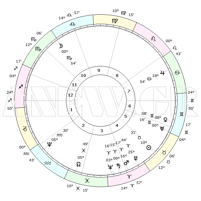 | | ΘΕΣΕΙΣ ΠΛΑΝΗΤΩΝ ΑΣΤΡΟΛΟΓΙΚΟΥ ΧΑΡΤΗ ΤΗΣ ΣΤΙΓΜΗΣ ΑΥΤΗΣ | | | | Πλανήτης | Ζώδιο | Μοίρες | Δεκαήμ. | Σε οίκο | Απόκλιση | | Ακμές των οίκων | | Ηλιος | Ταύρος | 10°29' | Δεύτερο | 5 | 14 N 58 | | 1ος | 11°05' | Τοξότης | | Σελήνη | Σκορπιός | 00°21' | Πρώτο | 11 | 15 S 23 | | 2ος | 14°00' | Αιγόκερως | | Ερμής | Κριός | 25°39' | Τρίτο | 4 | 08 N 06 | | 3ος | 21°34' | Υδροχόος | | Αφροδίτη | Δίδυμοι | 08°05' | Πρώτο | 6 | 22 N 32 | | 4ος | 27°31' | Ιχθείς | | Αρης | Κριός | 16°15' | Δεύτερο | 4 | 05 N 34 | | 5ος | 26°58' | Κριός | | Δίας | Καρκίνος | 18°54' | Δεύτερο | 8 | 22 N 29 | | 6ος | 20°34' | Ταύρος | | Κρόνος | Κριός | 09°14' | Πρώτο | 4 | 01 N 40 | | 7ος | 11°05' | Δίδυμοι | | Ουρανός | Δίδυμοι | 00°16' | Πρώτο | 6 | 20 N 02 | | 8ος | 14°00' | Καρκίνος | | Ποσειδώνας | Κριός | 03°15' | Πρώτο | 4 | 00 N 05 | | 9ος | 21°34' | Λέων | | Πλούτωνας | Υδροχόος | 05°30' | Πρώτο | 2 | 22 S 49 | | 10ος | 27°31' | Παρθένος | | Β. Δεσμός | Ιχθείς | 05°49' | Πρώτο | 3 | 09 S 22 | | 11ος | 26°58' | Ζυγός | | Ωροσκόπος | Τοξότης | 11°05' | Δεύτερο | | | 12ος | 20°34' | Σκορπιός | | Μεσουράνημα | Παρθένος | 27°31' | Τρίτο | | | |
