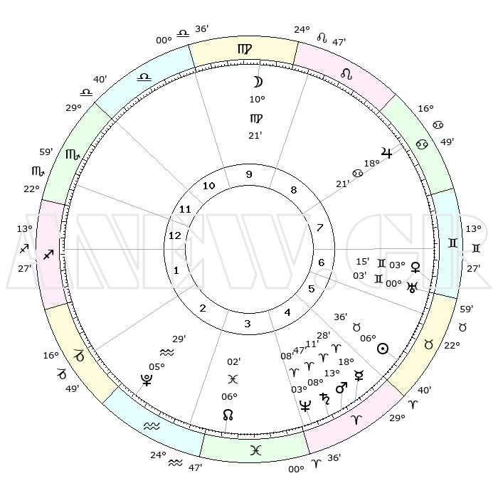 | | ΘΕΣΕΙΣ ΠΛΑΝΗΤΩΝ ΑΣΤΡΟΛΟΓΙΚΟΥ ΧΑΡΤΗ ΤΗΣ ΣΤΙΓΜΗΣ ΑΥΤΗΣ | | | | Πλανήτης | Ζώδιο | Μοίρες | Δεκαήμ. | Σε οίκο | Απόκλιση | | Ακμές των οίκων | | Ηλιος | Ταύρος | 06°33' | Πρώτο | 6 | 13 N 42 | | 1ος | 24°10' | Σκορπιός | | Σελήνη | Παρθένος | 09°30' | Πρώτο | 10 | 07 N 49 | | 2ος | 24°33' | Τοξότης | | Ερμής | Κριός | 18°21' | Δεύτερο | 5 | 05 N 03 | | 3ος | 29°19' | Αιγόκερως | | Αφροδίτη | Δίδυμοι | 03°10' | Πρώτο | 7 | 21 N 29 | | 4ος | 05°09' | Ιχθείς | | Αρης | Κριός | 13°08' | Δεύτερο | 5 | 04 N 21 | | 5ος | 06°51' | Κριός | | Δίας | Καρκίνος | 18°21' | Δεύτερο | 8 | 22 N 34 | | 6ος | 02°41' | Ταύρος | | Κρόνος | Κριός | 08°47' | Πρώτο | 5 | 01 N 29 | | 7ος | 24°10' | Ταύρος | | Ουρανός | Δίδυμοι | 00°03' | Πρώτο | 7 | 20 N 00 | | 8ος | 24°33' | Δίδυμοι | | Ποσειδώνας | Κριός | 03°08' | Πρώτο | 4 | 00 N 02 | | 9ος | 29°19' | Καρκίνος | | Πλούτωνας | Υδροχόος | 05°29' | Πρώτο | 3 | 22 S 48 | | 10ος | 05°09' | Παρθένος | | Β. Δεσμός | Ιχθείς | 06°02' | Πρώτο | 4 | 09 S 18 | | 11ος | 06°51' | Ζυγός | | Ωροσκόπος | Σκορπιός | 24°10' | Τρίτο | | | 12ος | 02°41' | Σκορπιός | | Μεσουράνημα | Παρθένος | 05°09' | Πρώτο | | | |